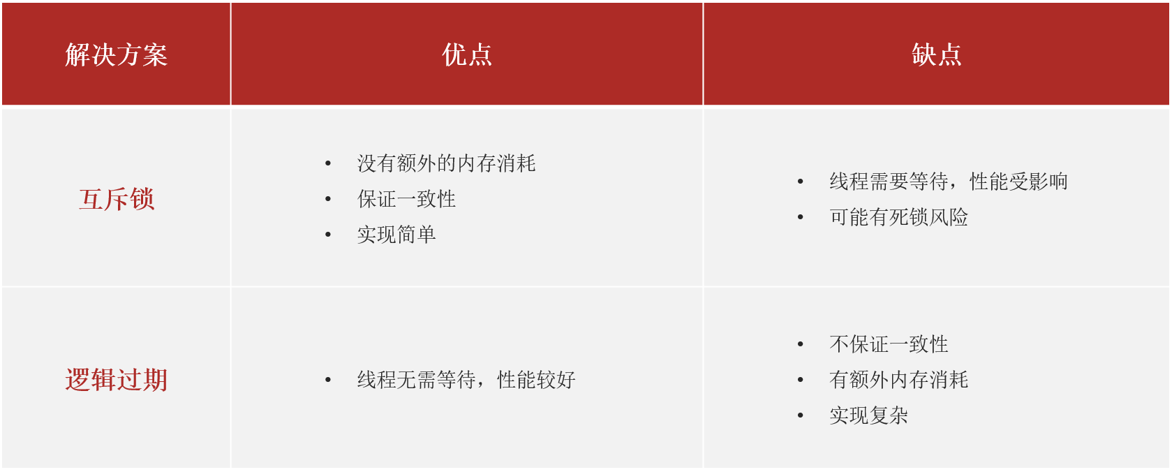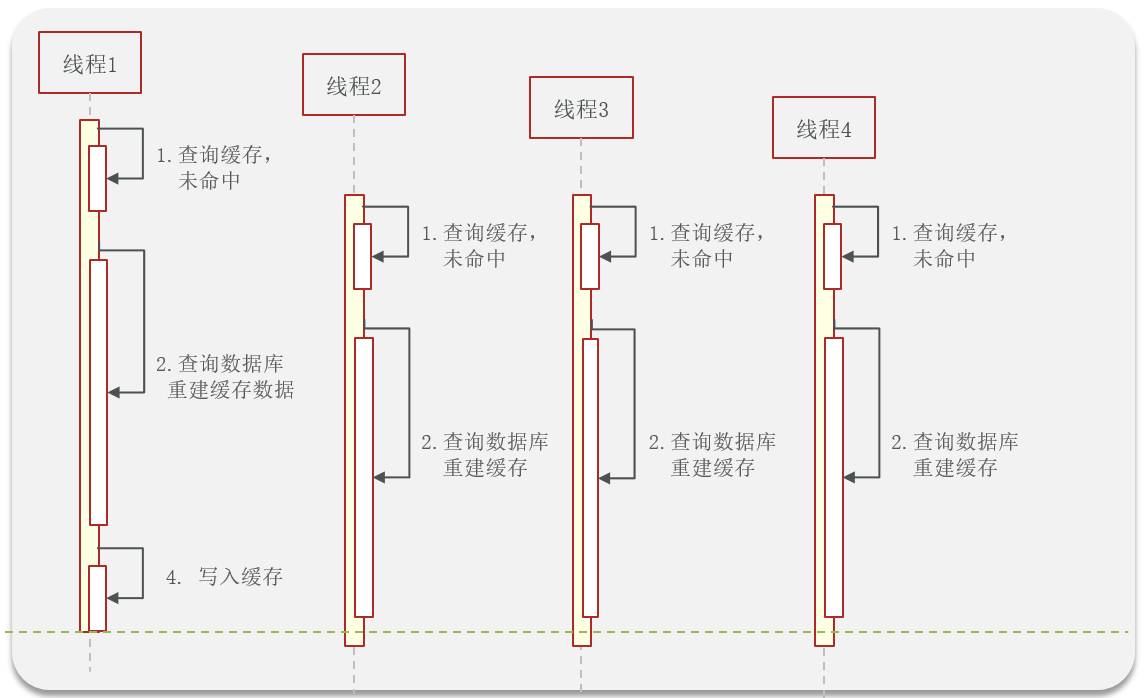 - 逻辑分析:假设线程1在查询缓存之后,本来应该去查询数据库,然后把这个数据重新加载到缓存的,此时只要线程1走完这个逻辑,其他线程就都能从缓存中加载这些数据了,但是假设在线程1没有走完的时候,后续的线程2,线程3,线程4同时过来访问当前这个方法, 那么这些线程都不能从缓存中查询到数据,那么他们就会同一时刻来访问查询缓存,都没查到,接着同一时间去访问数据库,同时的去执行数据库代码,对数据库访问压力过大