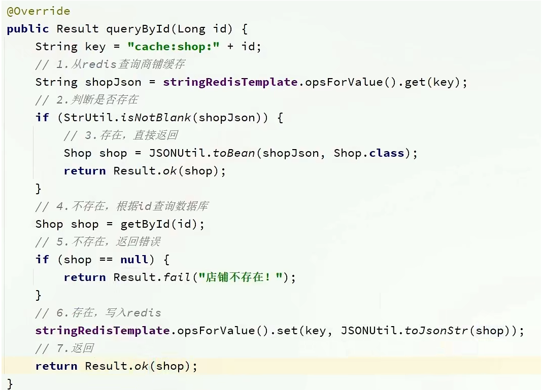 - 代码思路:如果缓存有,则直接返回,如果缓存不存在,则查询数据库,然后存入redis。