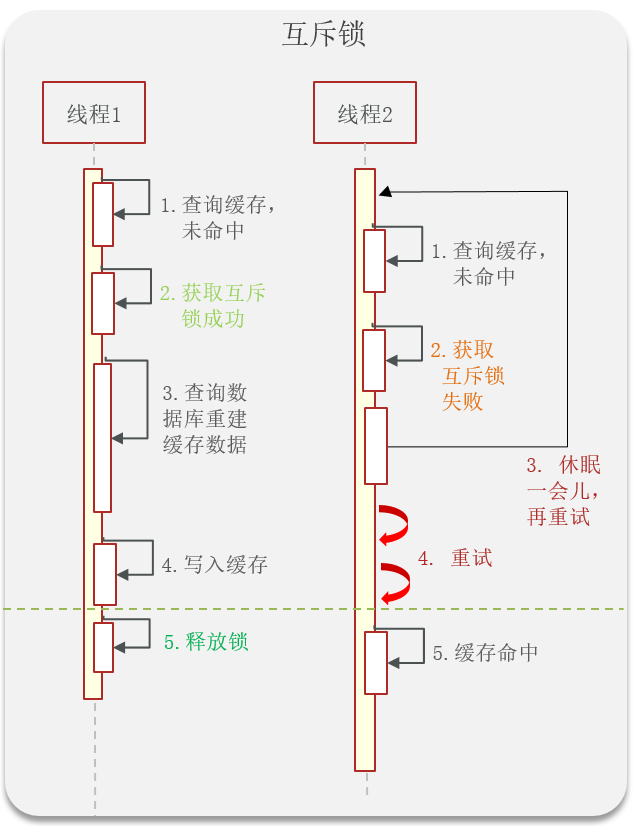- 核心思路:相较于原来从缓存中查询不到数据后直接查询数据库而言,现在的方案是 进行查询之后,如果从缓存没有查询到数据,则进行互斥锁的获取,获取互斥锁后,判断是否获得到了锁,如果没有获得到,则休眠,过一会再进行尝试,直到获取到锁为止,才能进行查询
