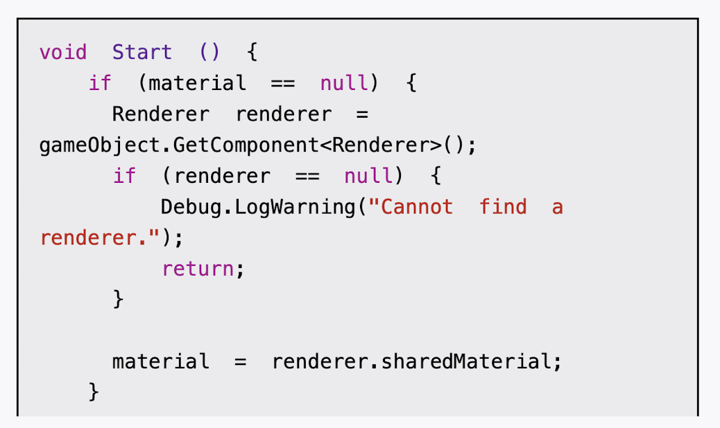 if (renderer == null) //如果为空,就尝试从使用该脚本所在的物体上得到相应的材质