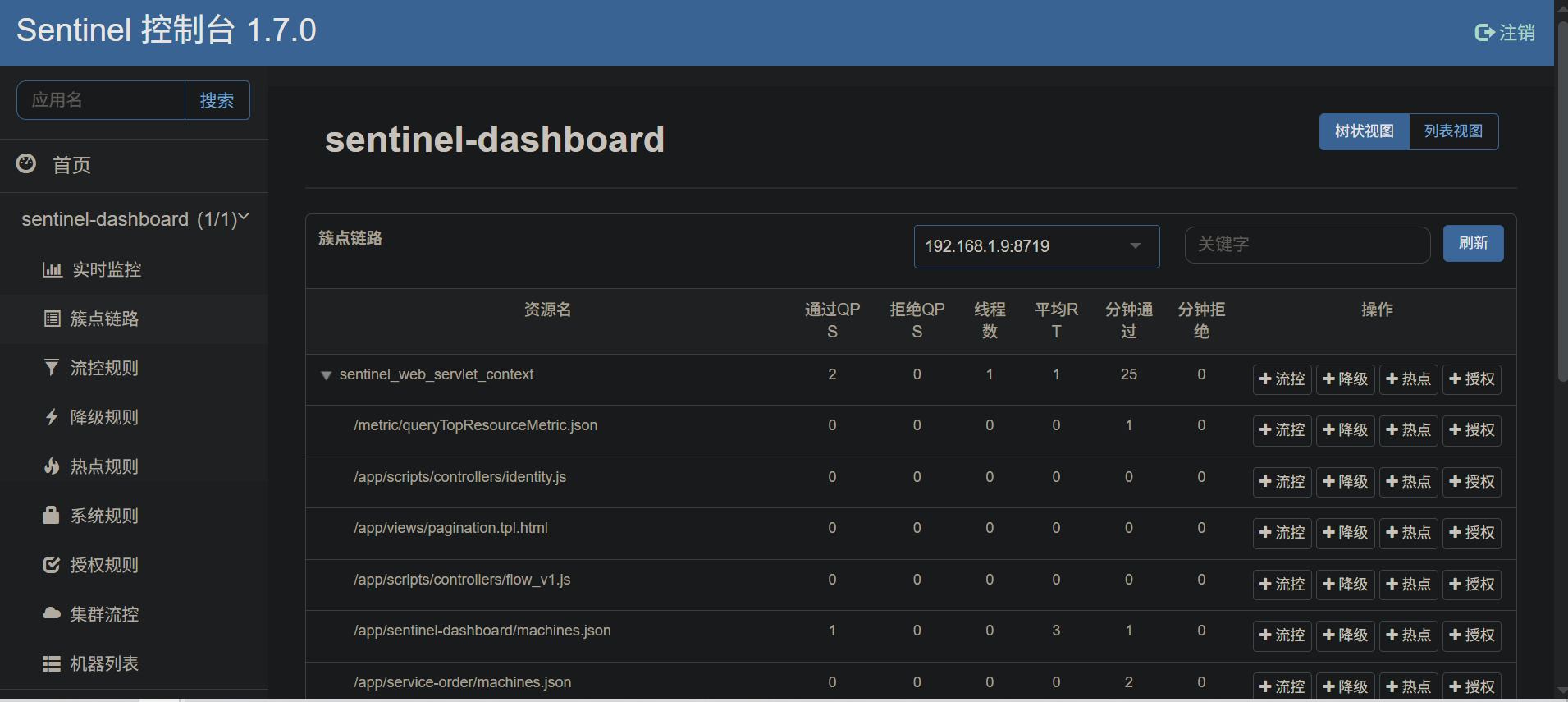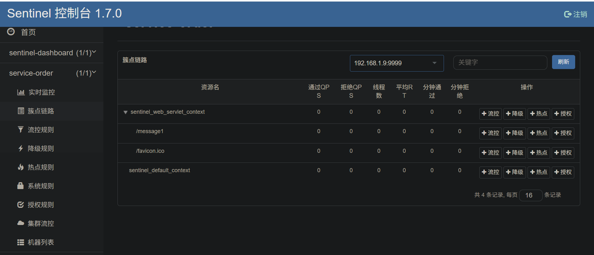 Sentinel 提供了实时的监控功能。通过控制台可以看到接入应用的单台机器秒