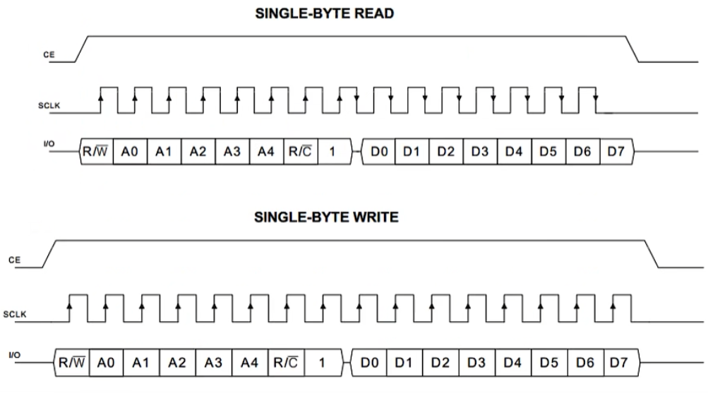 然后我们就可以写写入数据的函数了。写入之前先把CE寄存器置1。然后使用一个for循环把控制命令发送过去。每次在IO写入一位。然后给SCLK一个上升沿把数据法出去。控制命令写完后用一样的方式把数据给发送过去。发送结束后把CE置0.