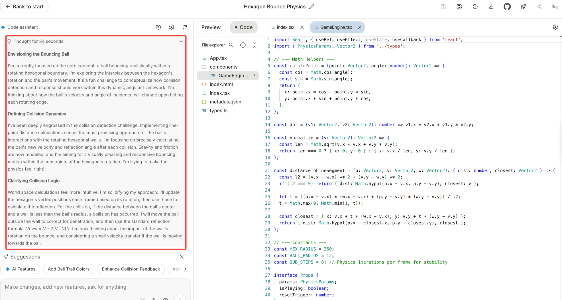 碰撞检测:小球与六边形墙壁碰撞时,需要按照物理规律反弹。:::