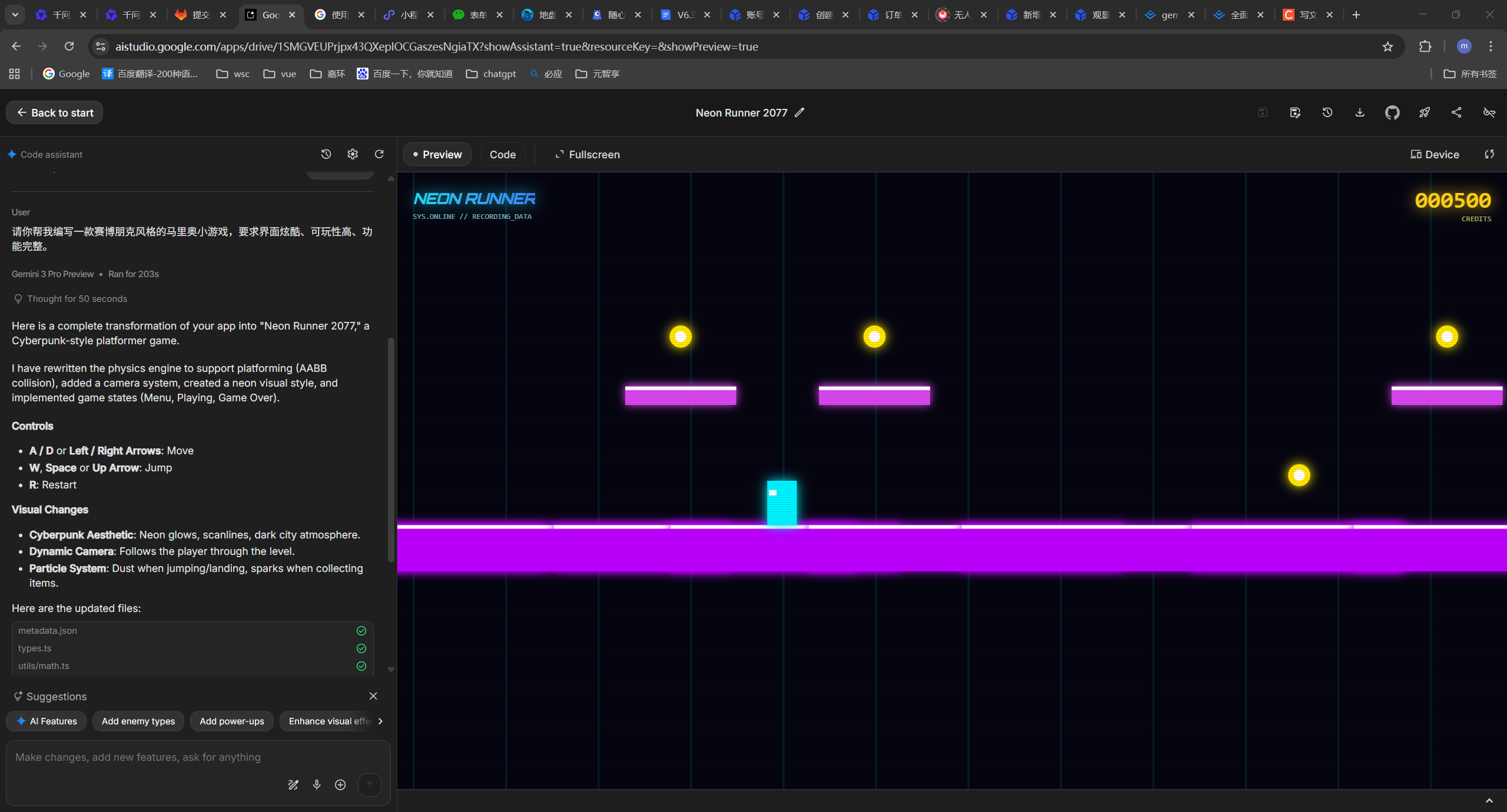 提示词:请你帮我编写一款赛博朋克风格的马里奥小游戏,要求界面炫酷、可玩性高、功能完整。