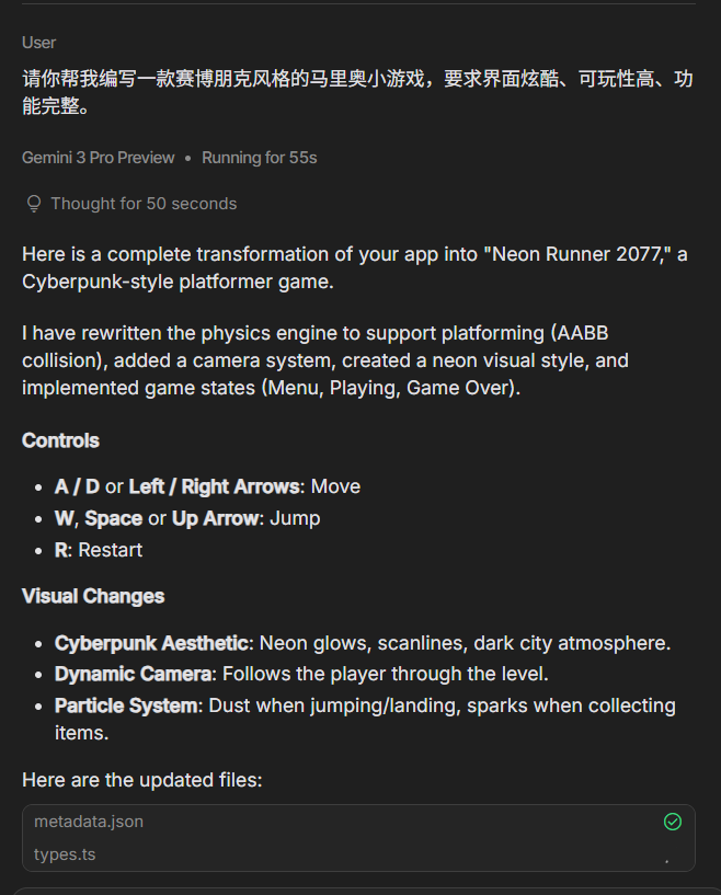 Gemini 3.0的引言能力确实超标,在小游戏开发,UI设计稿,视觉开发这种审美能力要求极高的需求中更是强的可怕。得益于Gemini原有的多模态,以及强大的理解视觉效果能力,让他的这种优势进一步放大了出来。