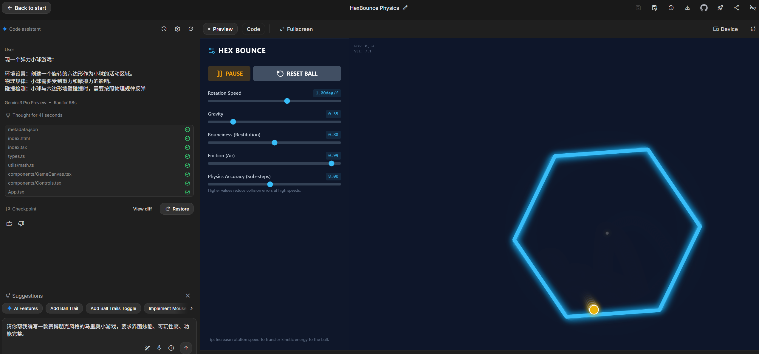 生成完成了,我们来看一下效果,可以发现Gemini对物理规律的理解是非常不错的,而且页面风格和交互体验也不错。