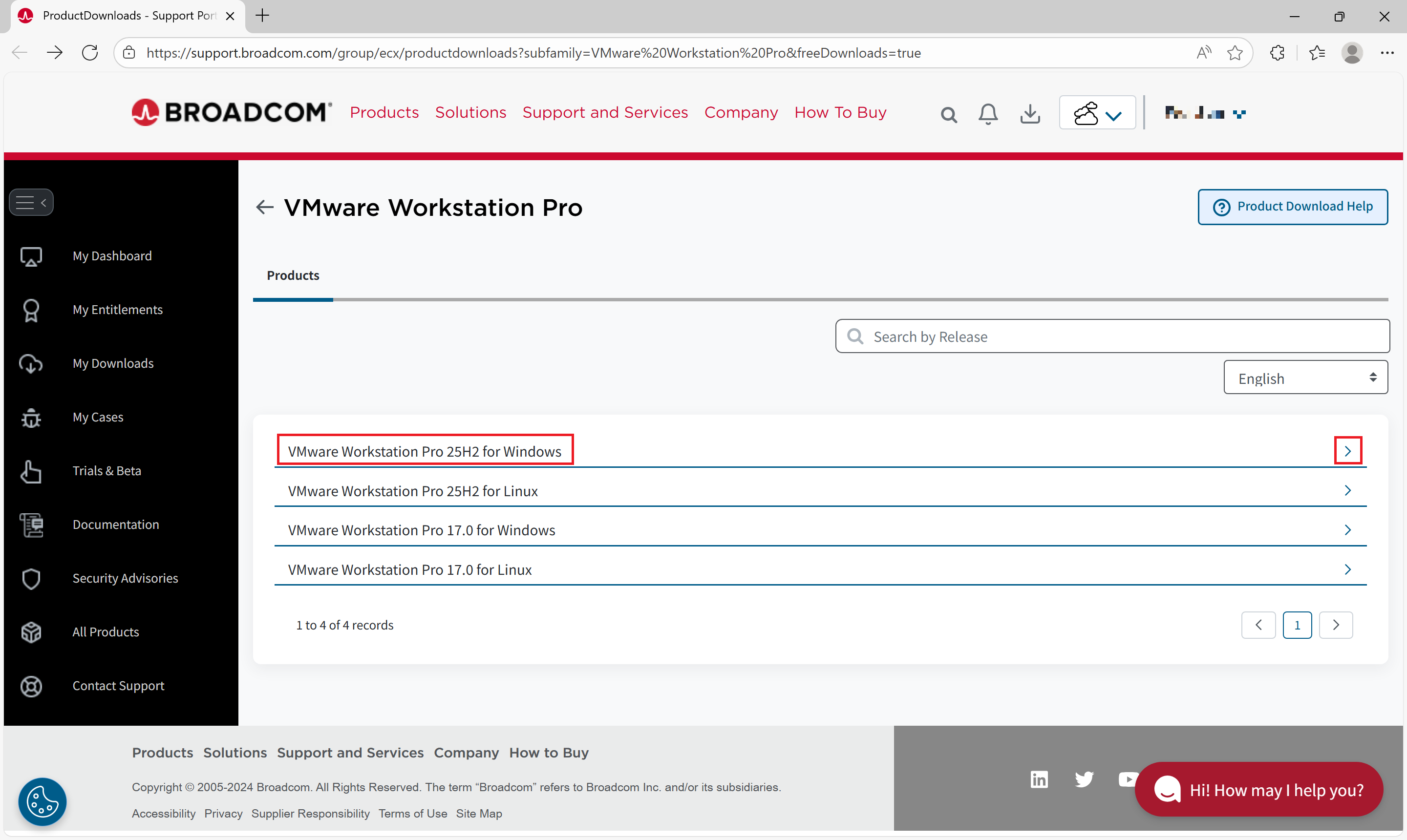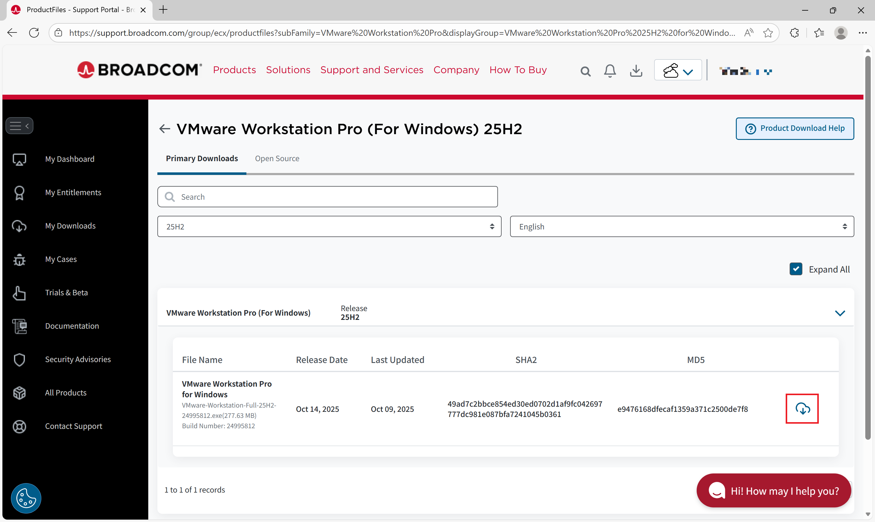 VMware Workstation Pro 17.5之后允许个人用户免费用于学习,默认自行安装完成,由于VMware已经被博通收购,所以下载前需要注册成功博通的账号,并且处于登录状态,下载地址如下,这次我们用最新版的25H2,但是25H2是纯英文版本的,不熟悉的可以继续用17.5.2
