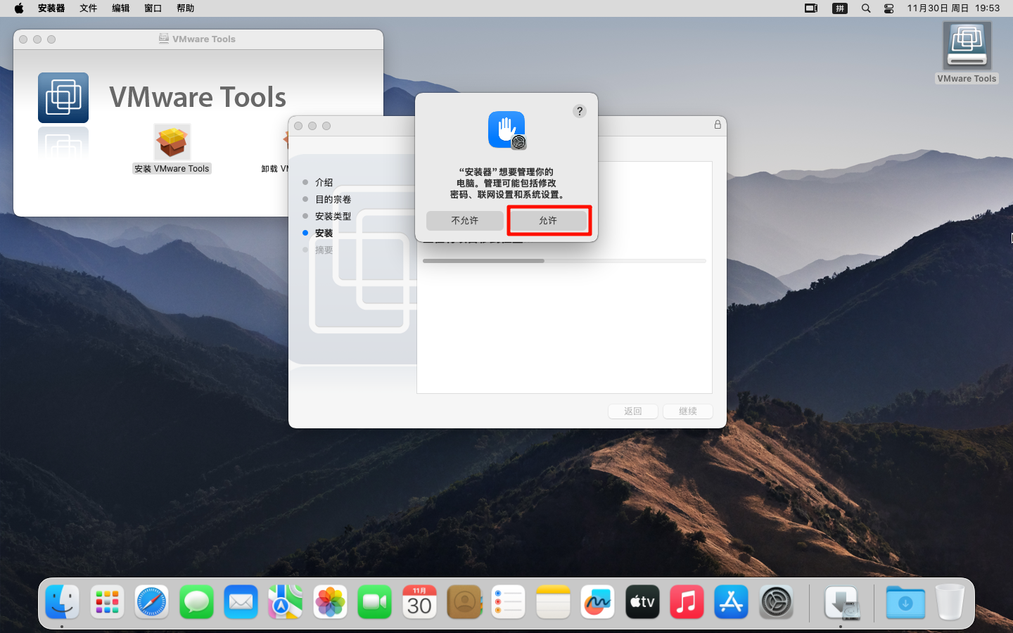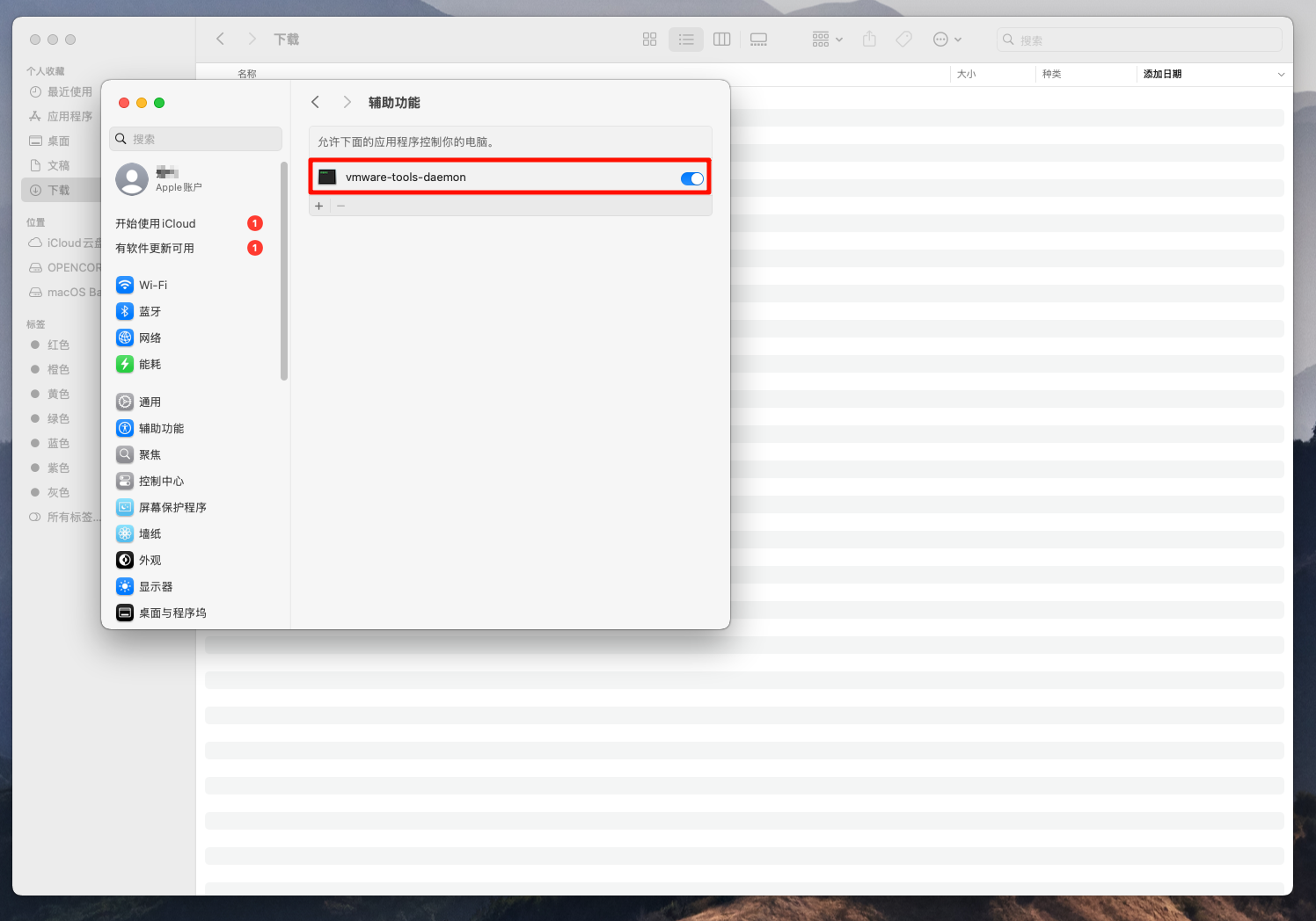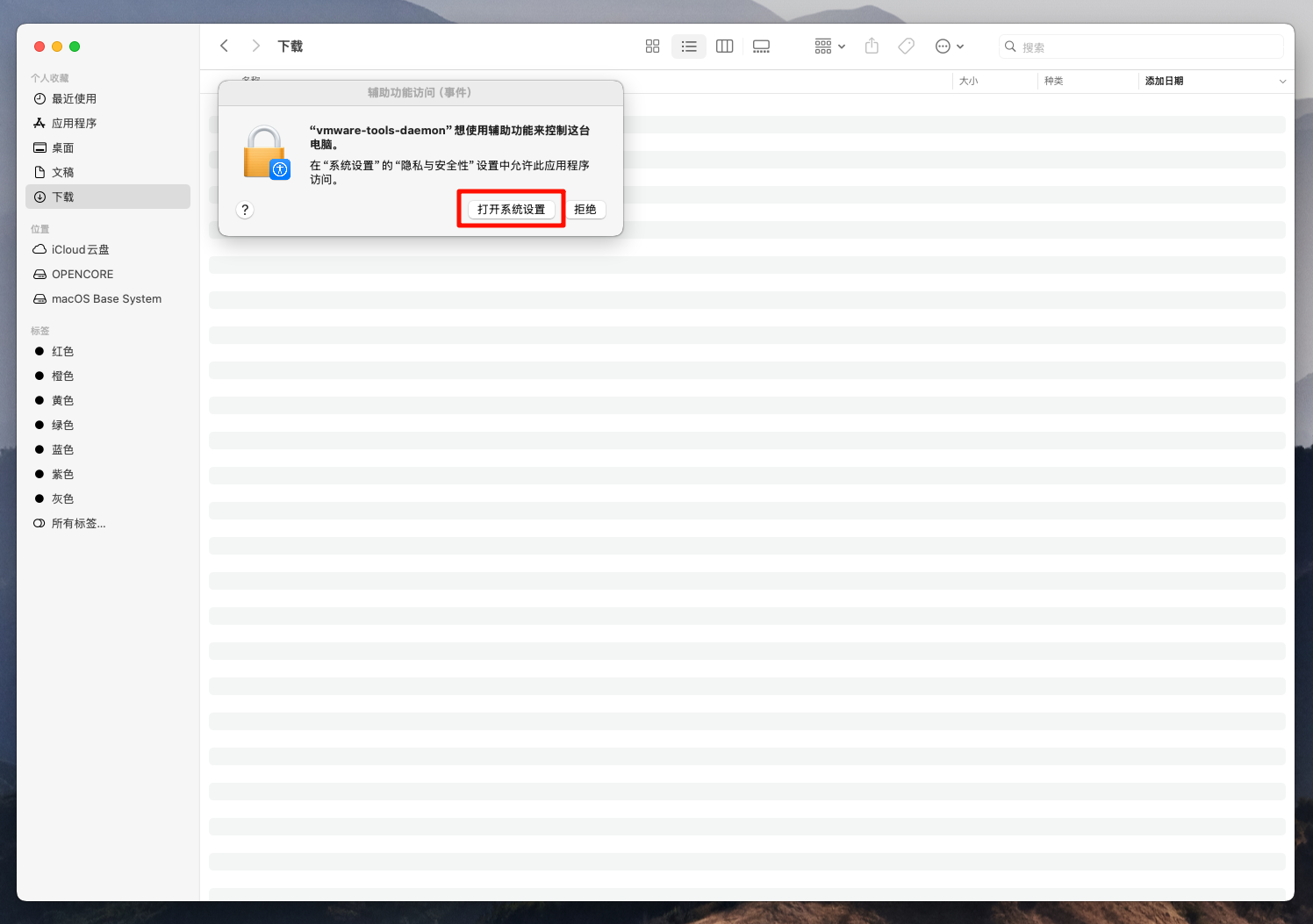第一次放文件,会提示需要允许VMtools使用辅助功能,操作如下