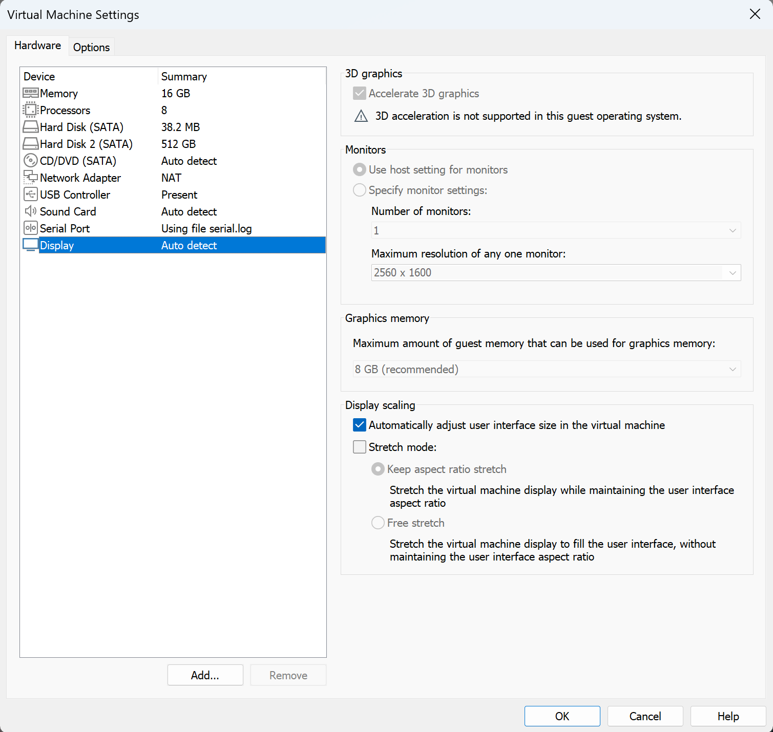 因为我宿主机内存比较大,所以设置了8GB显存,可以看情况调整,但是3D加速,也有可能导致某些软件更加卡顿,谨慎使用
