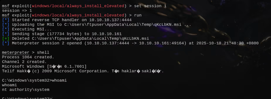 这里使用了好几个没有成功,所以就没有尝试了,看来wp,发现使用的是windows/local/always_install_elevated