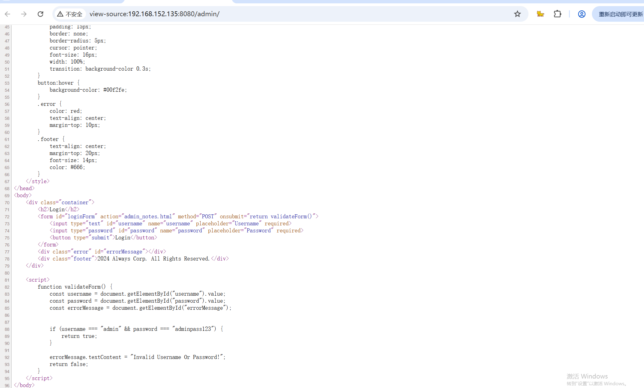 查看网页源码看看有没有提示,结果看到了它是前端的校验,账号密码是admin:adminpass123