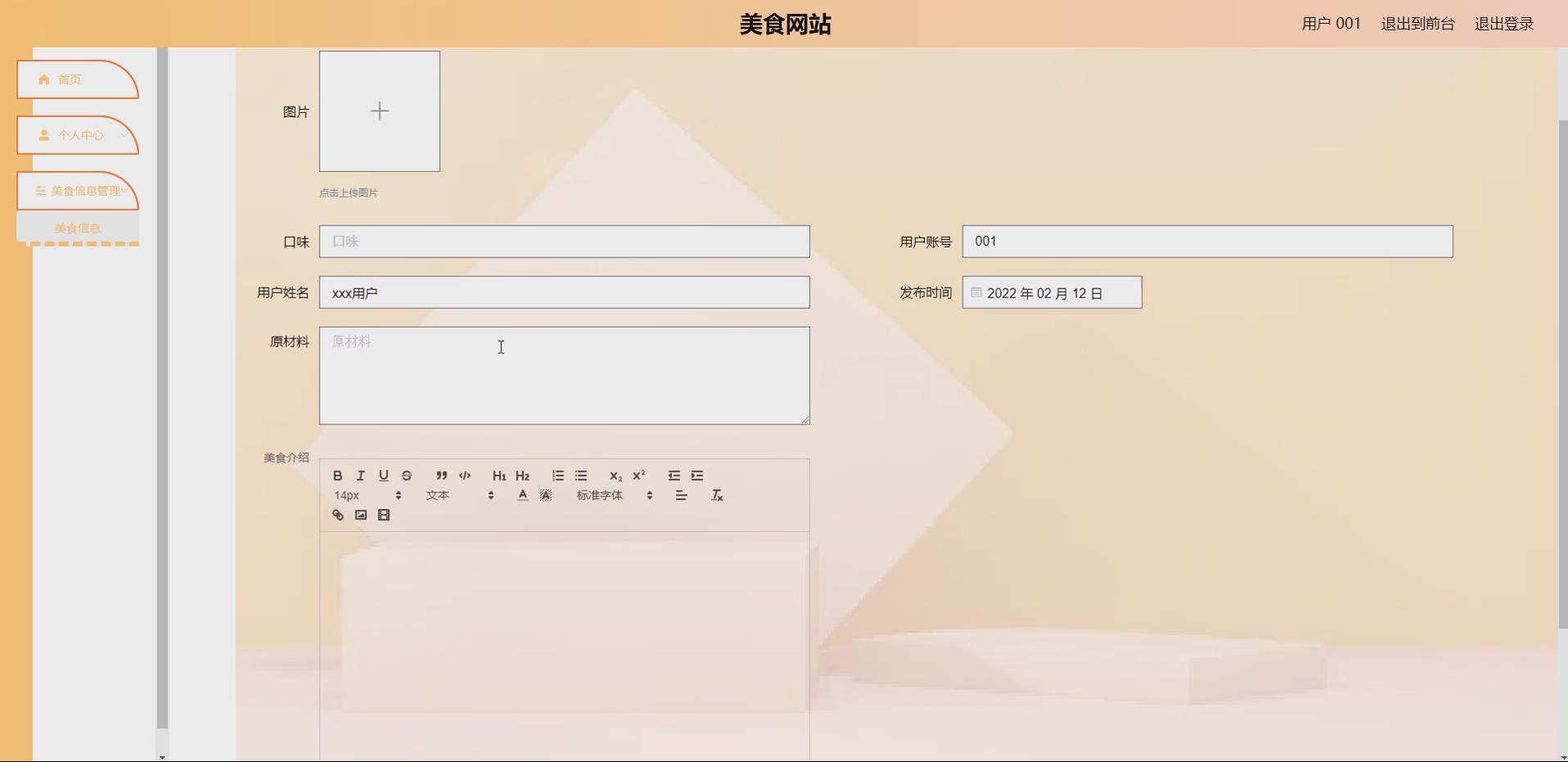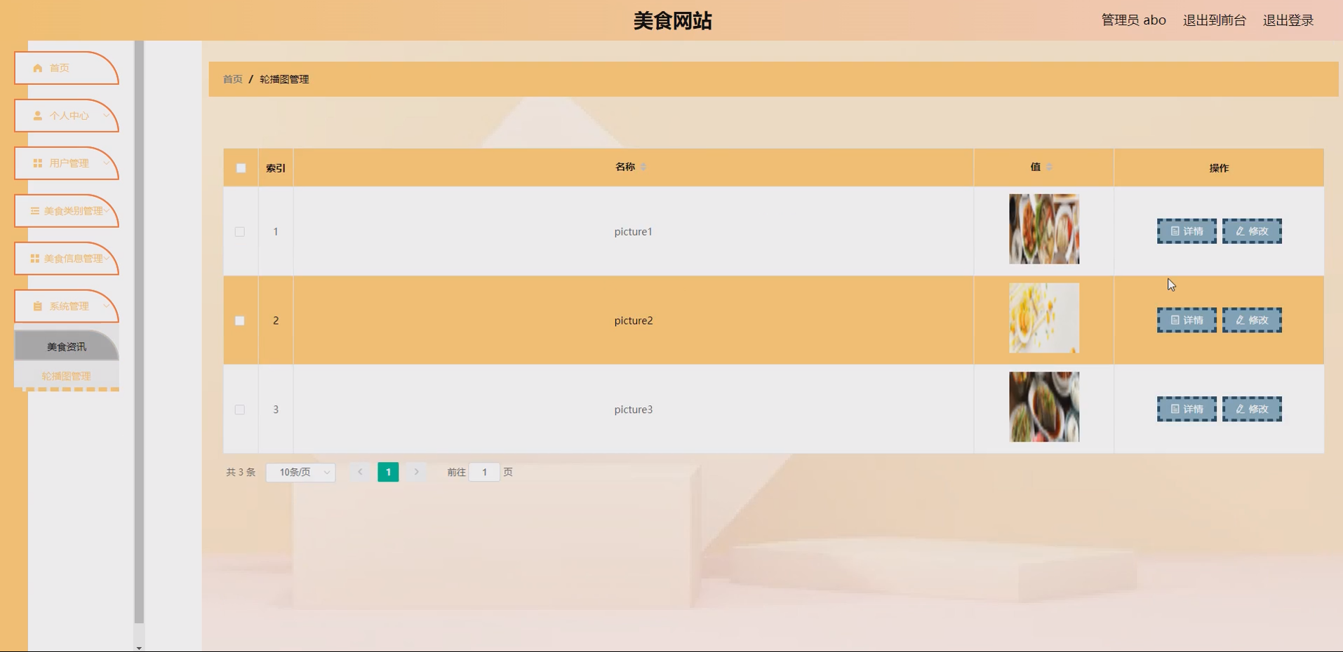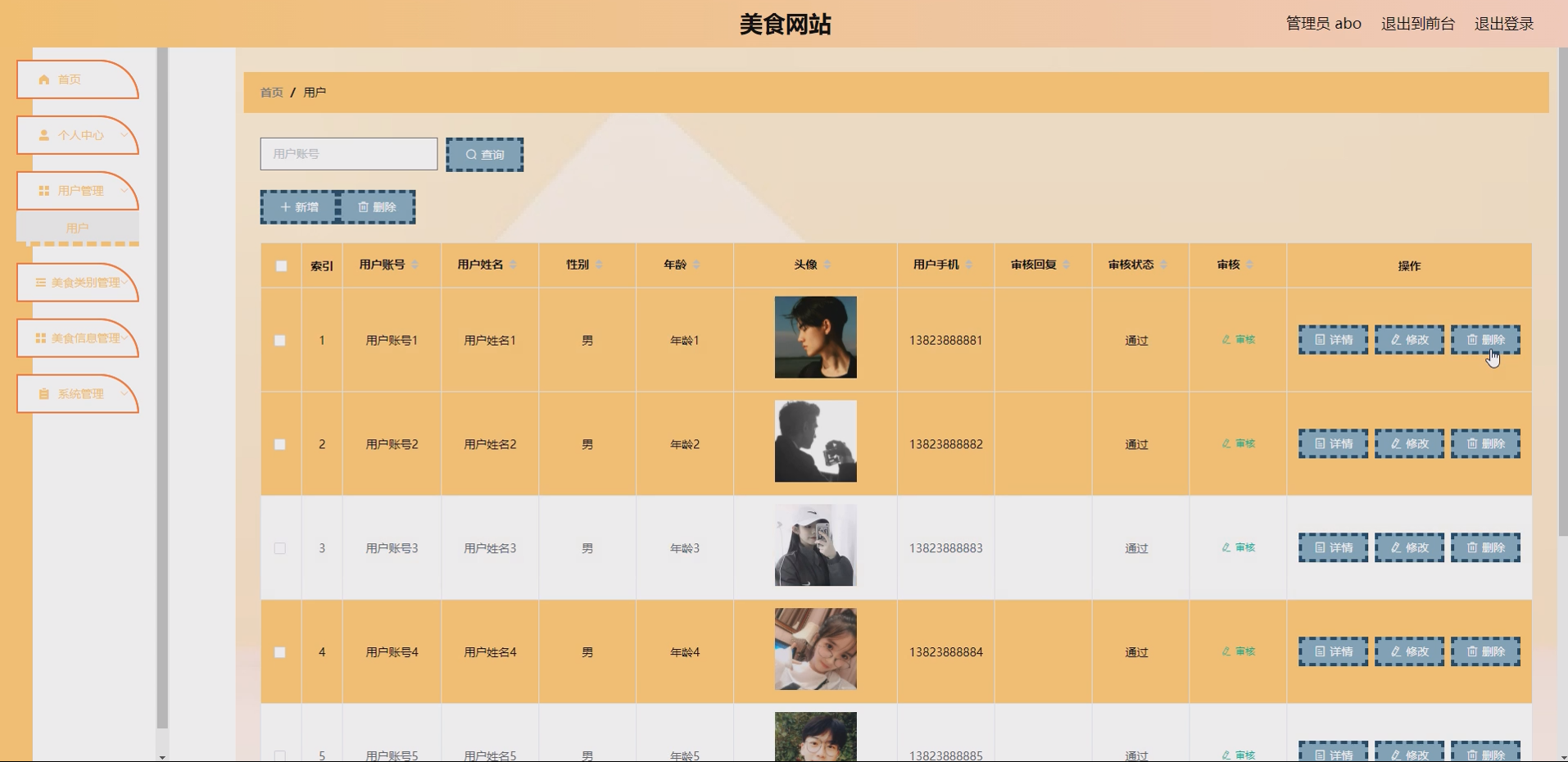 系统项目功能:用户,美食类别,美食信息