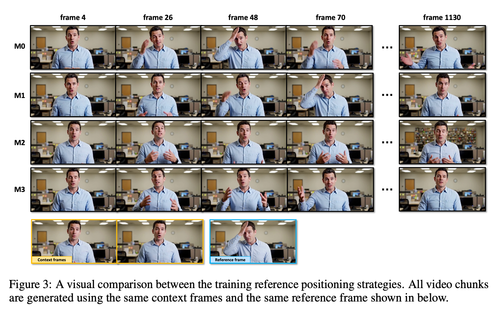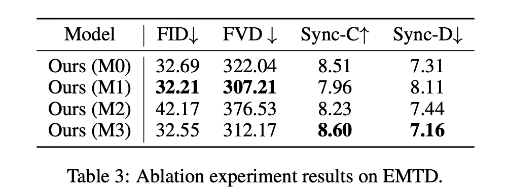 如表 3 所示,M0 策略因随机采样而控制强度过高,导致模型不恰当地复制参考动作,削弱了同步性。M1 策略虽然在视觉质量上表现尚可,但在同步性上表现较差,因为它过于严格地复制了边界帧。M2 策略因参考帧与上下文帧的时间距离过远,导致模型对身份和背景的控制力不足,最终在视觉质量(FID、FVD)上表现最差。