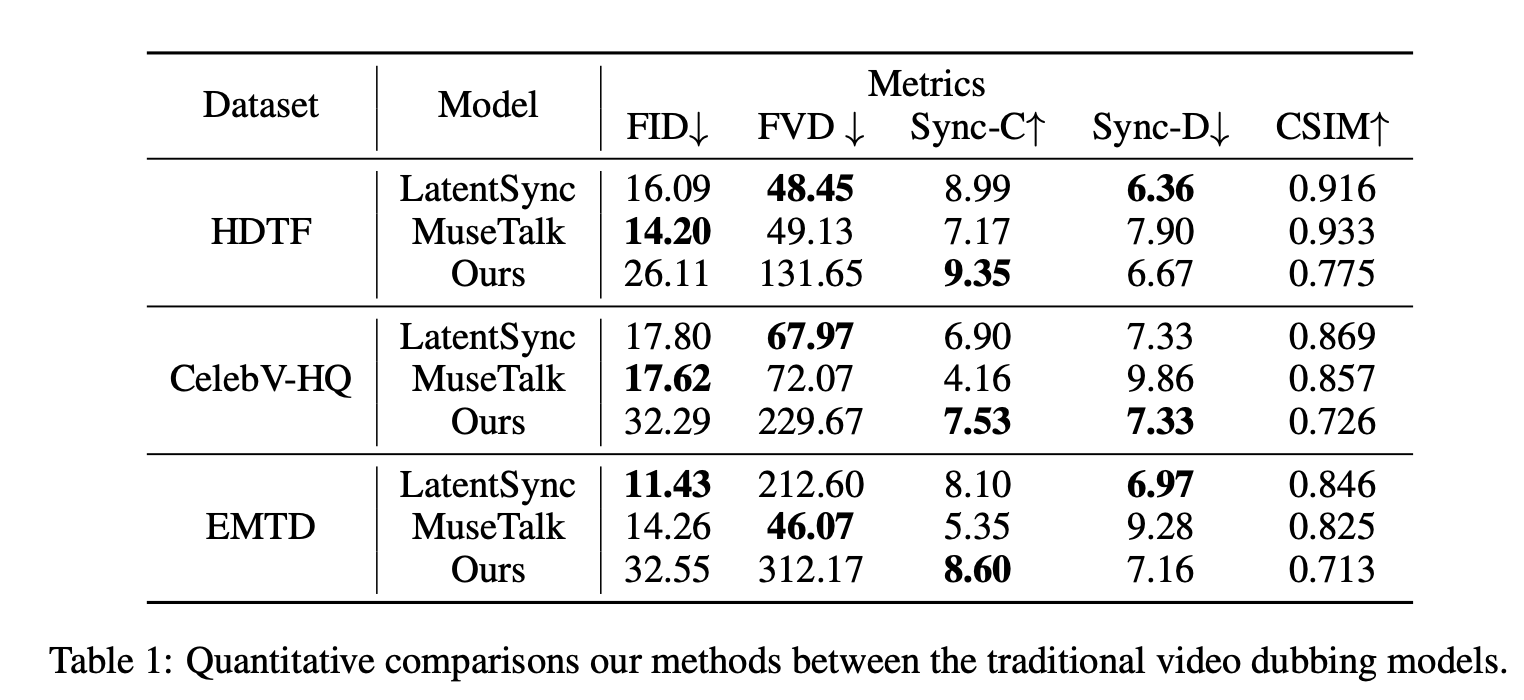 video dubbing 是内容全球化传播的关键环节,它通过将源视频的音频替换为新语言的配音,使内容能够触达更广阔的受众。然而,长期以来,这项技术一直面临一个核心的"僵局"------其编辑范围的局限性。传统的 video dubbing 技术,例如 MuseTalk 和 LatentSync,通常专注于对嘴部区域进行"修复式"编辑,以实现口型与新音频的同步。这种方法的主要局限在于,它几乎不触及人物的面部表情、头部转动和肢体动作。