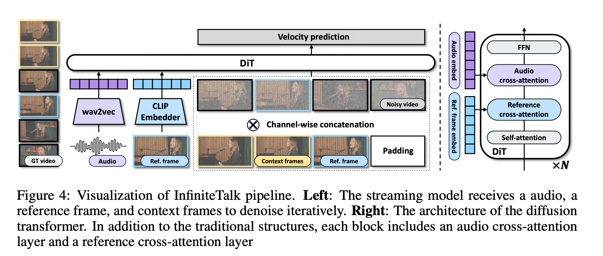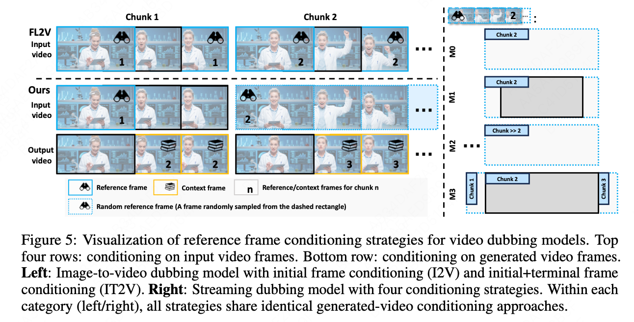 为了应对无限长度的视频序列生成任务,InfiniteTalk 采用了流式(streaming)生成架构,整体网络框架如下图 4 所示。其工作原理是将一个超长视频分解为多个小的、可管理的视频片段(chunks),然后逐一进行生成。然而,与简单的分段生成不同,InfiniteTalk 的核心在于其精巧设计的"上下文帧"(context frames)机制。