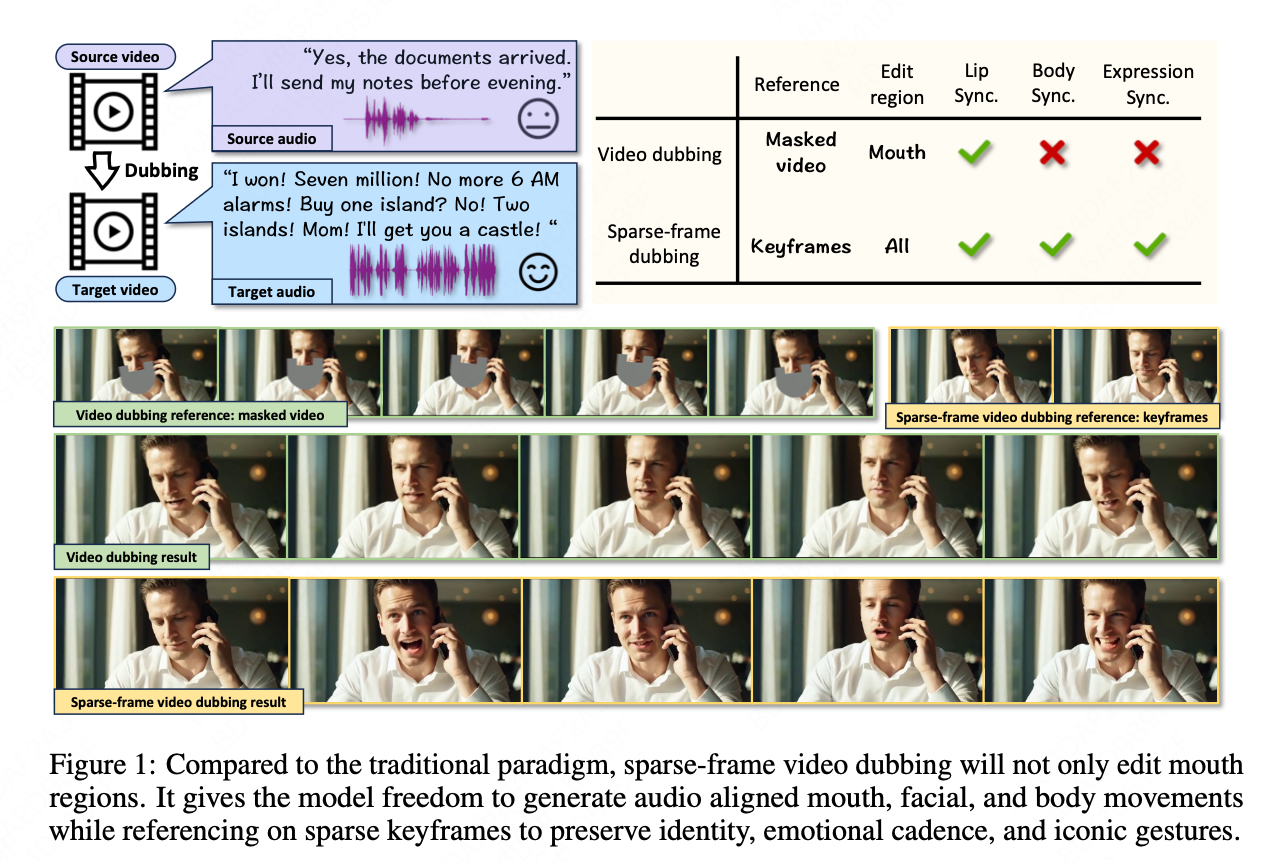 传统 video dubbing 技术长期受限于其固有的"口型僵局",即仅能编辑嘴部区域,导致配音所传递的情感与人物的面部、肢体表达严重脱节,削弱了观众的沉浸感。现有新兴的音频驱动视频生成模型,在应对长视频序列时也暴露出身份漂移和片段过渡生硬等问题。为解决这些痛点,我们引入并提出了一种全新的技术范式------"稀疏帧 video dubbing"(sparse-frame video dubbing)。