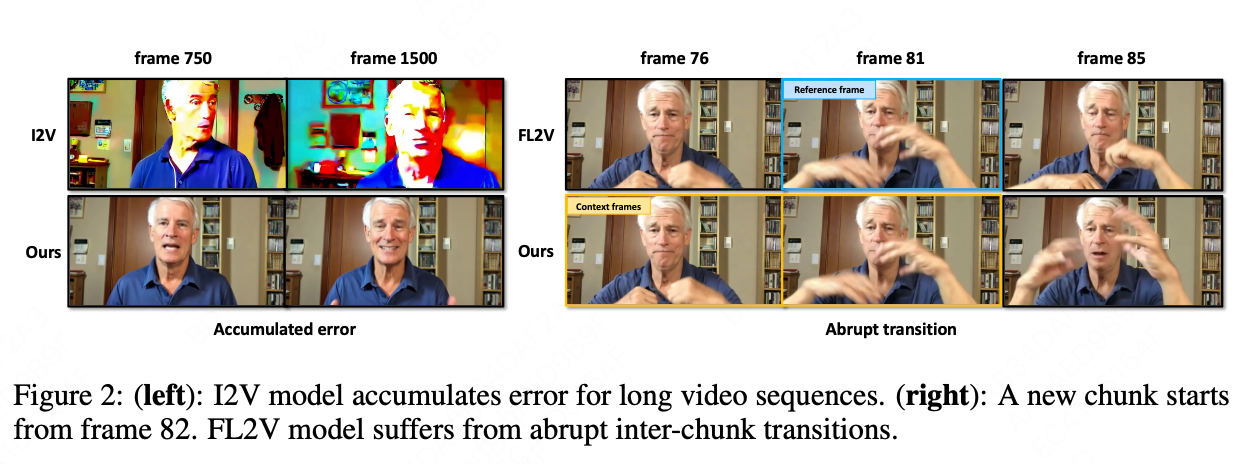 其次是基于首末帧转视频(First-Last-frame-to-Video, FL2V)的方法。该方法试图通过同时使用视频片段的起始帧和终止帧作为参考来解决累积误差。然而,这种策略带来了另一个问题:过渡生硬, 如图 2(右)。FL2V 模型生成过程缺乏从前一片段向后一片段传递的"动量信息",不同视频片段之间的动作衔接会显得突兀和不自然,打破了视频流的连续性。与此同时,其过于严格地遵循固定的参考帧,强制生成的视频在片段(chunk)的边界上精确复制参考帧的姿态,即使这种姿态与新音频的情感或节奏相悖。