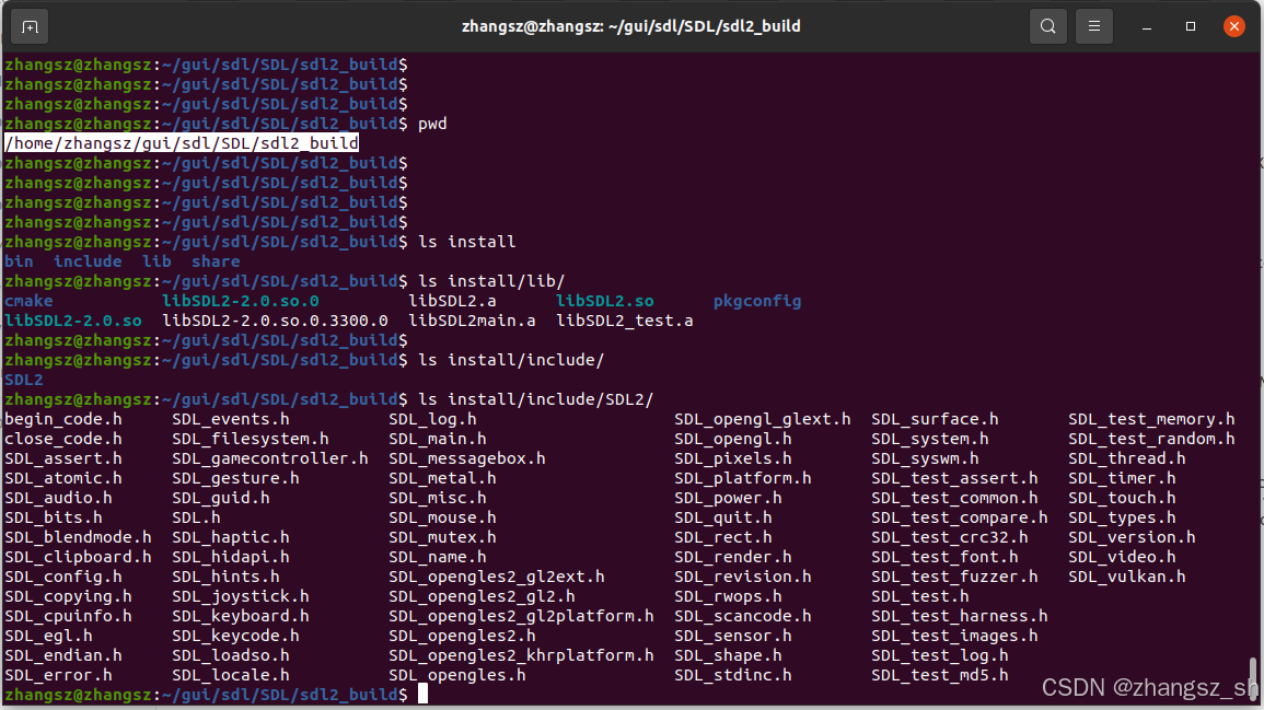 make install后, SDL2 编译的产物(lib 库、头文件等),放在了制定的安装目录下