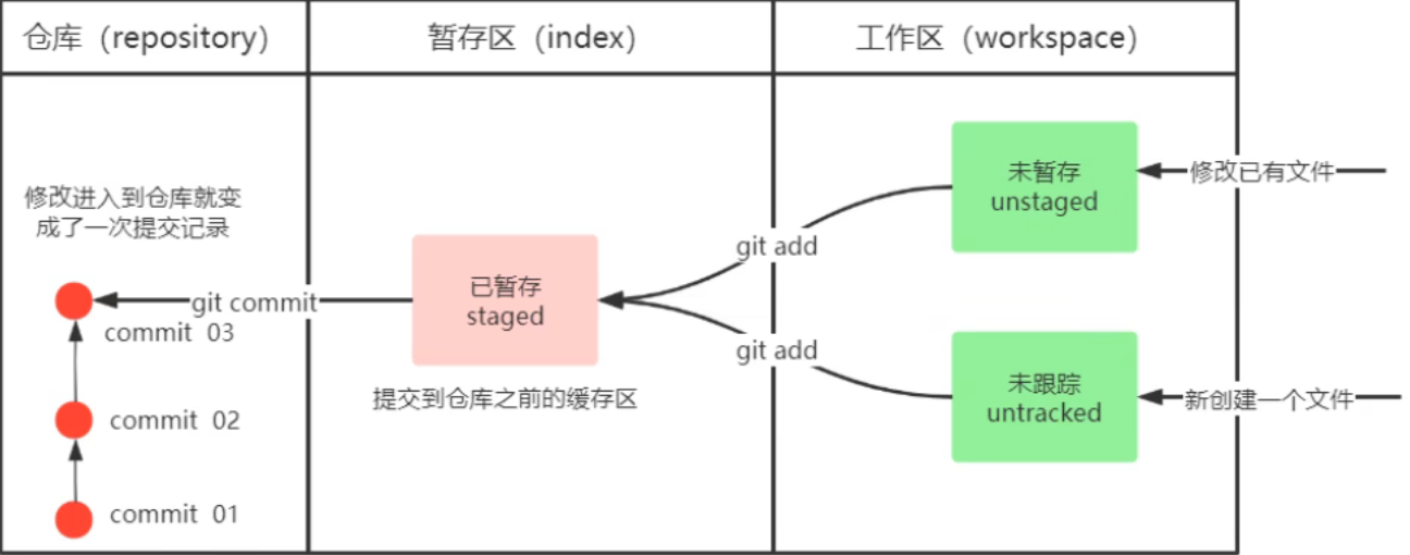 Git工作目录下对于文件的修改(增加,删除,更新)会存在几个状态,这些修改的状态会随着我们执行Git的命令而发生变化。