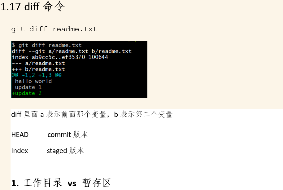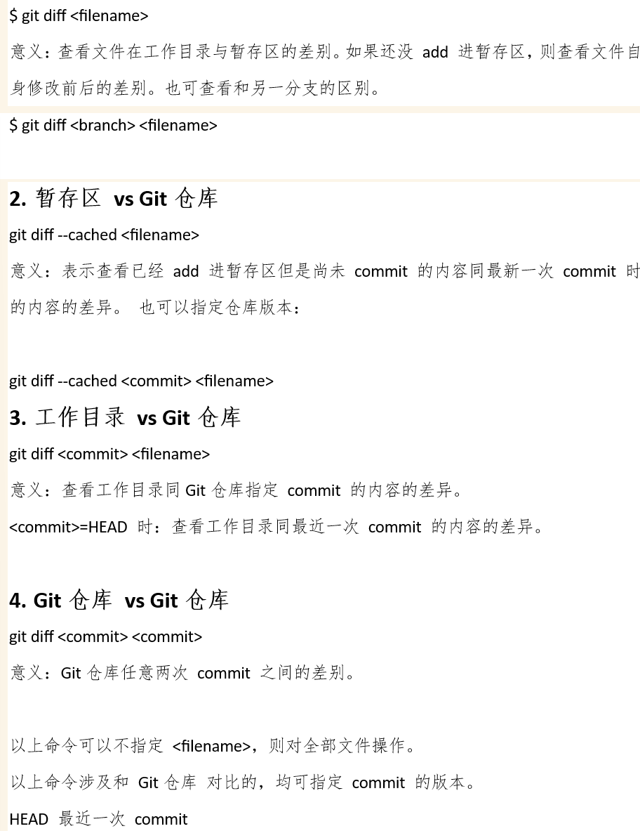 \] :匹配任何一个列在方框中的字符,如\[ab\]匹配a或者匹配b "?":问号匹配一个任意字符 \[n-m\]:匹配所有在这两个字符范围内的字符,如\[0-9\]表示匹配所有0到9的数字 ```bash # 忽略当前路径下的logs目录,包含logs下的所有子目录和文件 logs/ # 忽略根目录下的logs.txt文件 /logs.txt # 忽略所有后缀为.class的文件 *.class # 不忽略classes目录下的a.class文件 !classes/a.class # 只忽略tmp目录下的.txt文件 tmp/*.txt # 可以忽略/foo,a/foo,a/b/foo等 **/foo ``` * 匹配模式最后跟(/)说明要忽略的是目录 * 要忽略指定模式以外的文件或目录,可以在模式前加上感叹号(!)进行取反 ### **java开发通用模版** ```bash #java *.class #package file *.war *.ear *.zip *.tar.gz *.rar #maven ignore target/ build/ #eclipse ignore .settings/ .project .classpatch #Intellij idea .idea/ /idea/ *ipr *.iml *.iws # temp file *.log *.cache *.diff *.patch *.tmp #system ignore .DS_Store Thumbs.db ``` ### **diff命令(用于查看修改变化)**    ### 6、Git stash 作用是将目前还不想提交的但是已经修改的内容进行保存至堆栈中,后续可以在某个分支上回复出堆栈中的内容。也就是说,stash中的内容不仅可以恢复到原先开发的分支,也可以恢复到其他任意指定的分支上。git stash作用的范围包括工作区和暂存区中的内容,也就是说没有提交的内容都会保存在堆栈中。 git stash \[-u/-a/-all