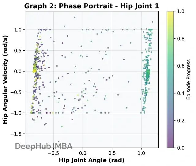 光看分数不够,还得检查运动学特征。下图是髋关节的相位图,横轴关节角度,纵轴角速度。