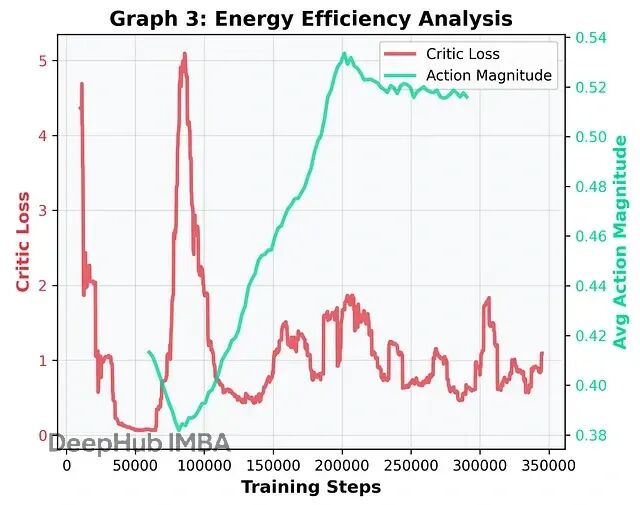 "熟练掌握"阶段(200k步以后) :极限环形成,Critic损失骤降,智能体对物理世界不再感到意外。有意思的是动作幅度:在200k附近达到峰值后反而略有下降然后趋于平稳。这是熟练运动的典型特征,智能体学会了借力,不再每一步都用蛮力,而是顺着动力学"流"起来,能量消耗得到了优化。