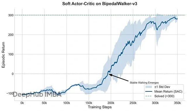 到了150k-250k步,方差突然爆炸。这是个关键转折期,智能体开始尝试高风险策略,有时走得漂亮,有时摔得很惨。只有进入300k步之后的稳定区,均值高、方差收窄,这样才能考虑"冻结"策略用于实际部署。方差收窄意味着策略从"碰运气"进化到了"真会走"。