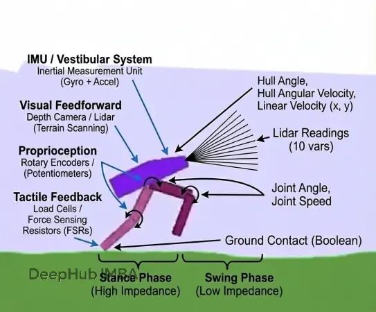 躯干角度和速度对应前庭系统------"躯干"代表质心位置,硬件上用IMU(惯性测量单元)采集平衡数据。关节编码器对应本体感觉,仿真里提供的关节角度和速度,在真实假肢上由霍尔传感器和旋转编码器获取。激光雷达对应视觉前馈,现代研究型假肢已经开始集成深度相机来预判地形。