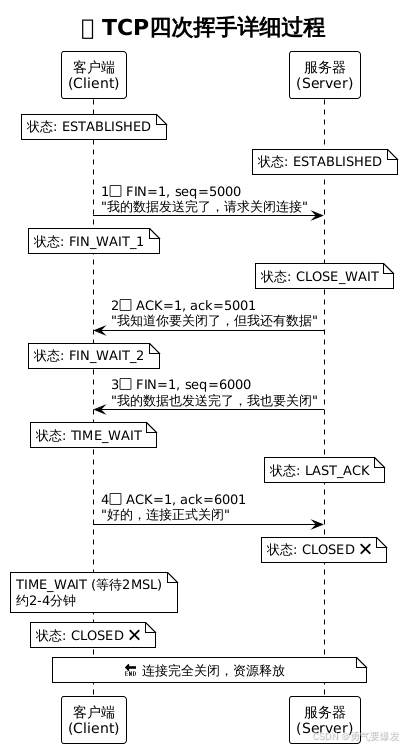| 4️⃣ | 客户端→服务器 | ACK=1, ack=6001 | TIME_WAIT→CLOSED | 确认完全关闭 |