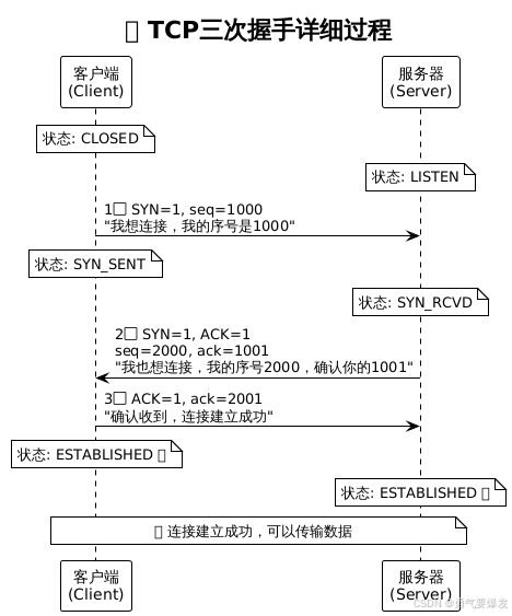 | 3️⃣ | 客户端→服务器 | ACK=1, ack=2001 | SYN_SENT→ESTABLISHED | 确认连接建立 |