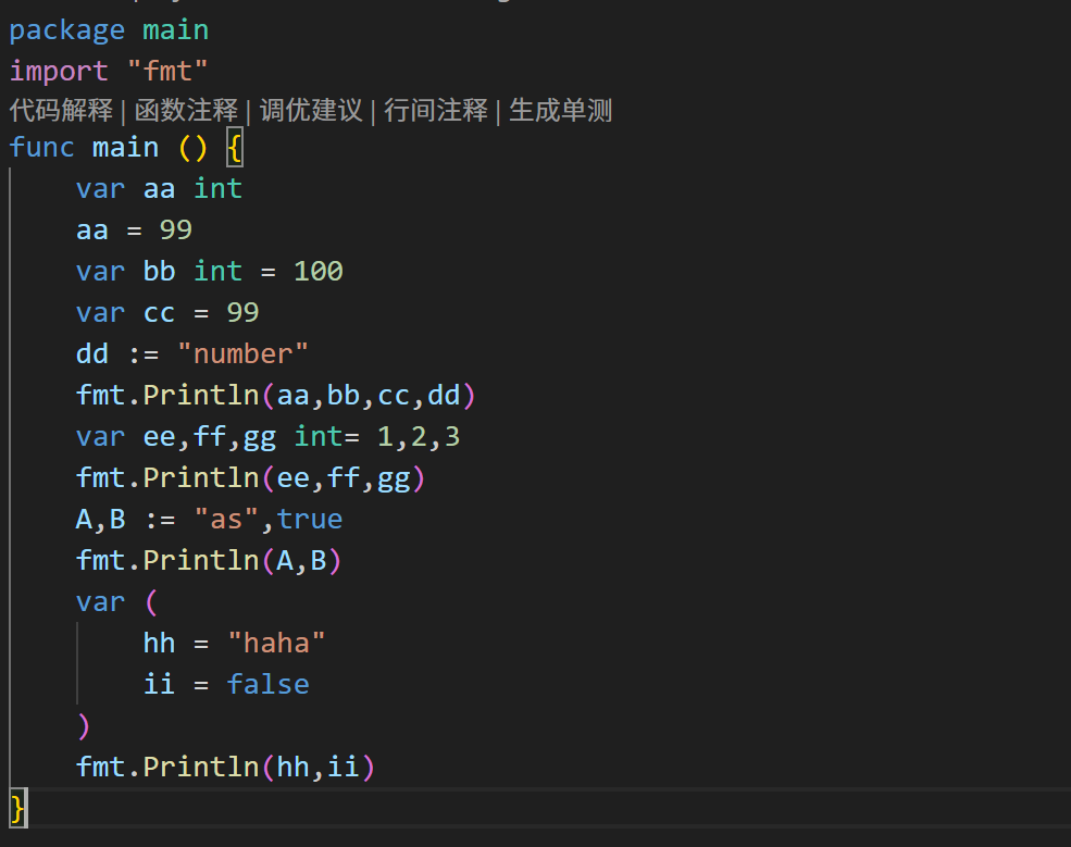 4.省略var时,cc := "go" 等同于var cc = "go"