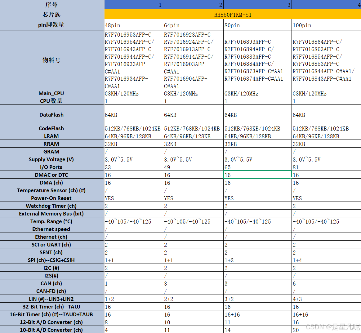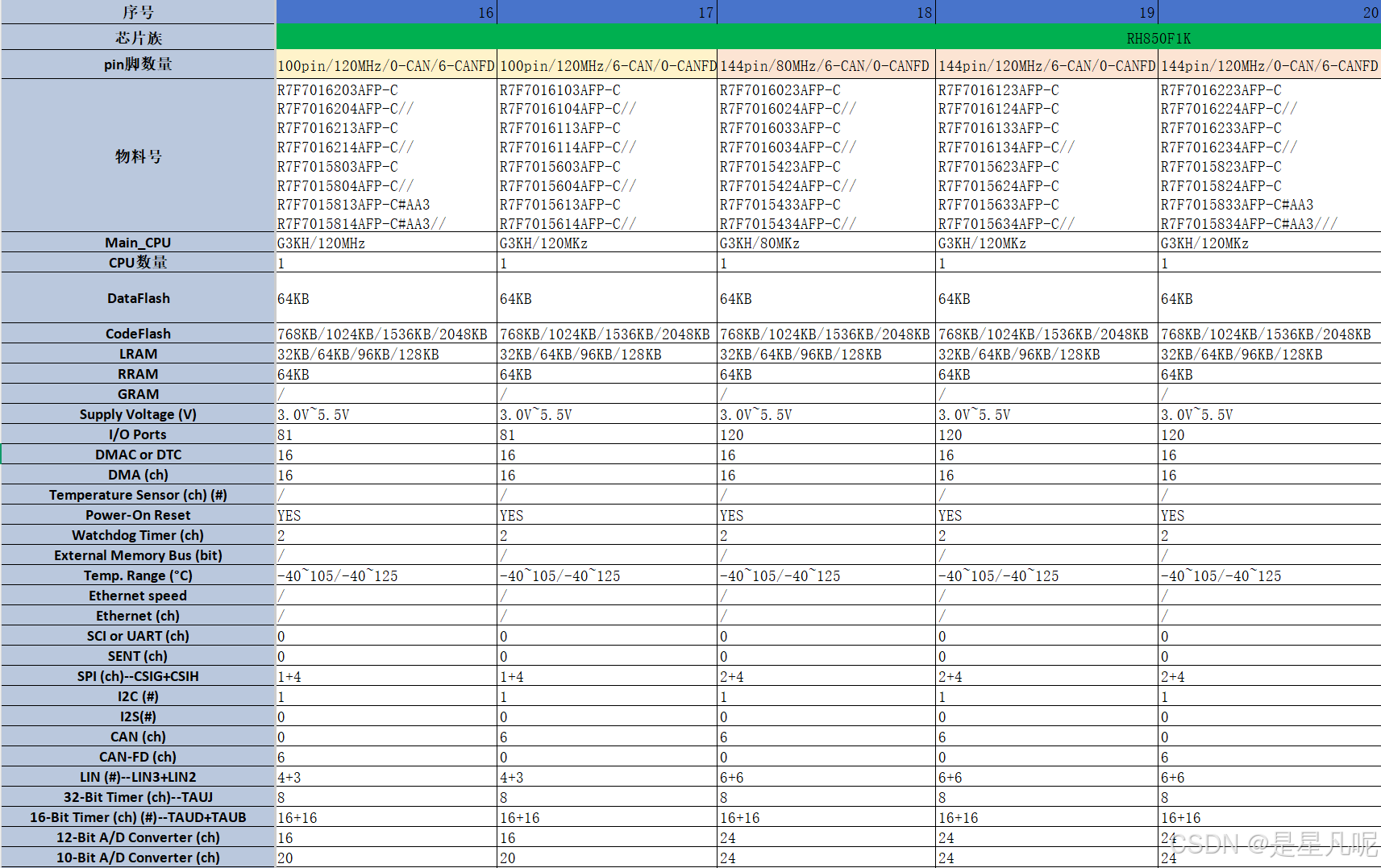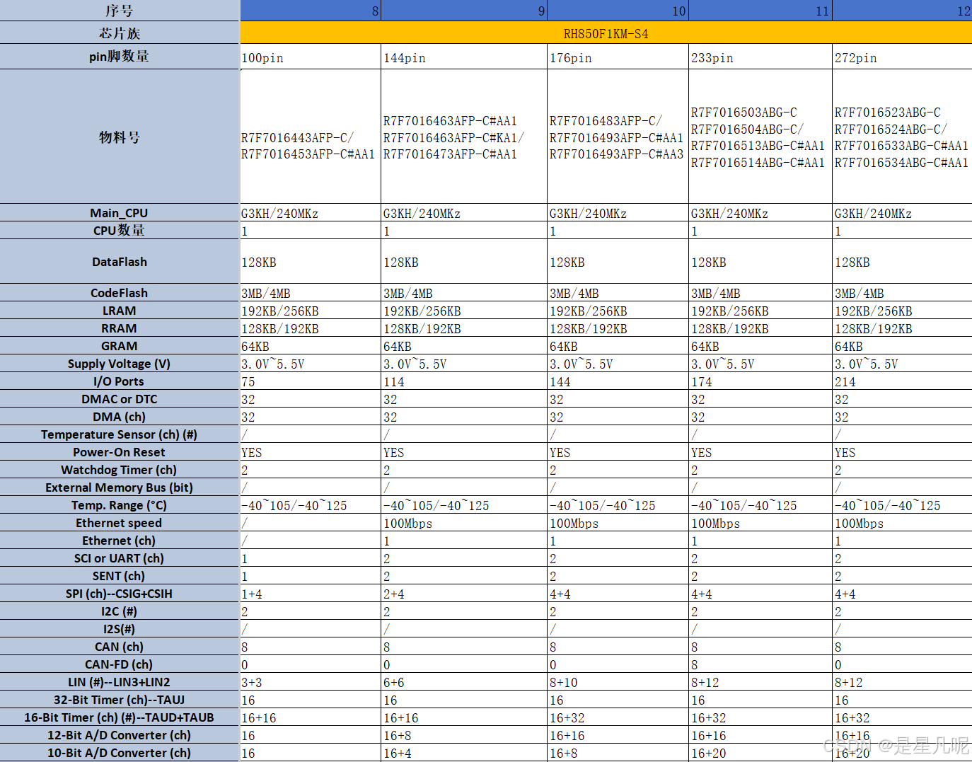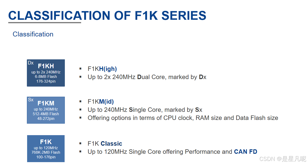 F1K系列的型号类型还是相对而言比较多的,根据PIN脚,ROM/RAM大小,甚至是CAN/CANFD的数量都可以进行分类。