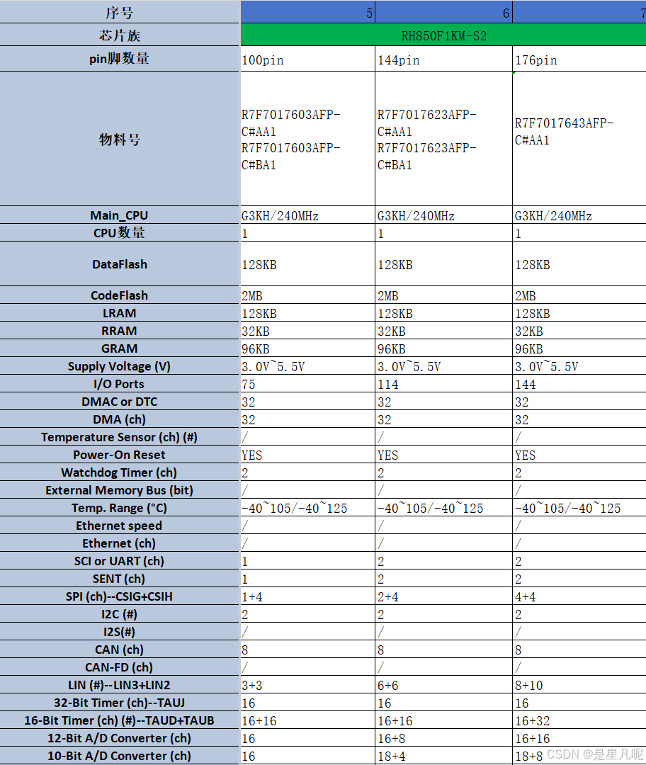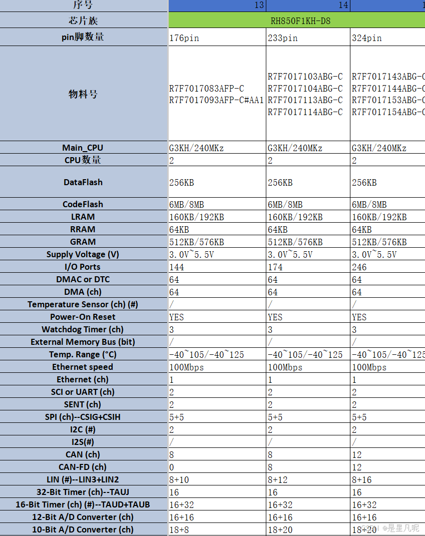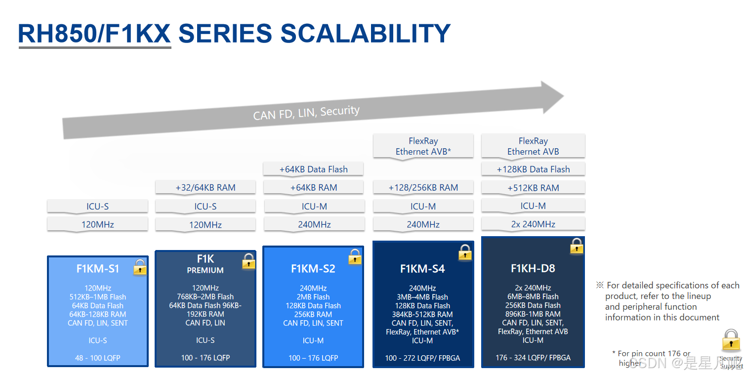 对于其资源来讲,按照下图的顺序主频越来越高,ICU即信息功能安全等级也越来越高,RAM也是呈现逐步提高的态势。