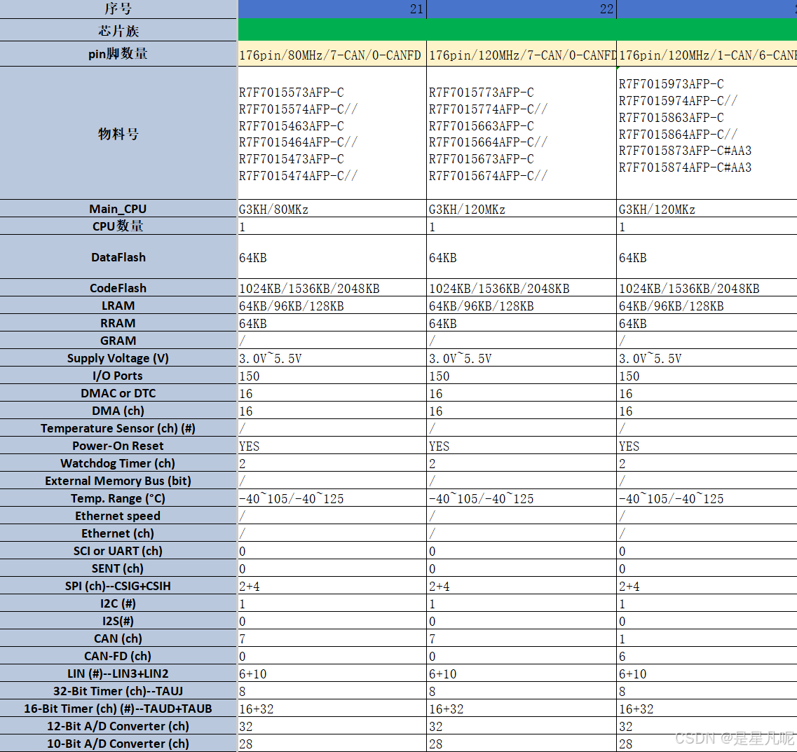 笔者总结了一些常用的外设参数信息,详细的还需要查询手册才可以得到。值得注意是下面的表格中没有特别标明其支持CANFD数量,但是其CAN外设控制器也是支持CANFD功能的。