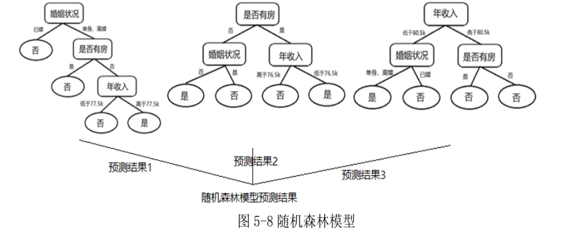 例如,对于输入样本X={婚姻状况=单身,是否有房=有,年收入=67.2k},图5-8所示随机森林模型对该样本的预测输出应为"是",表示该客户可能会拖欠贷款。这是由于尽管图5-8中最左侧决策树对该样本的预测值为"否",但其它两棵决策树对该样本的预测值均为"是",故根据相对多数投票法可得随机森林模型的预测输出为"是"。随机森林模型在Bagging集成策略基础上进一步增加了弱学习器之间的差异性,这使得随机森林模型能有效解决许多实际问题。
