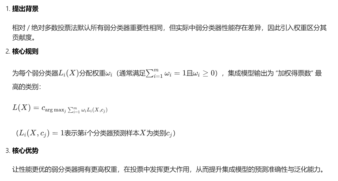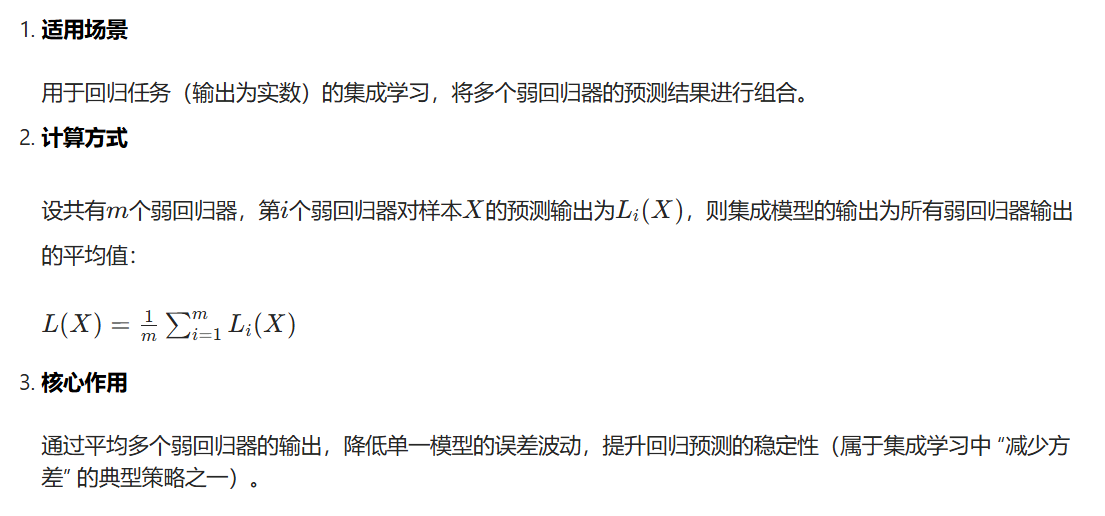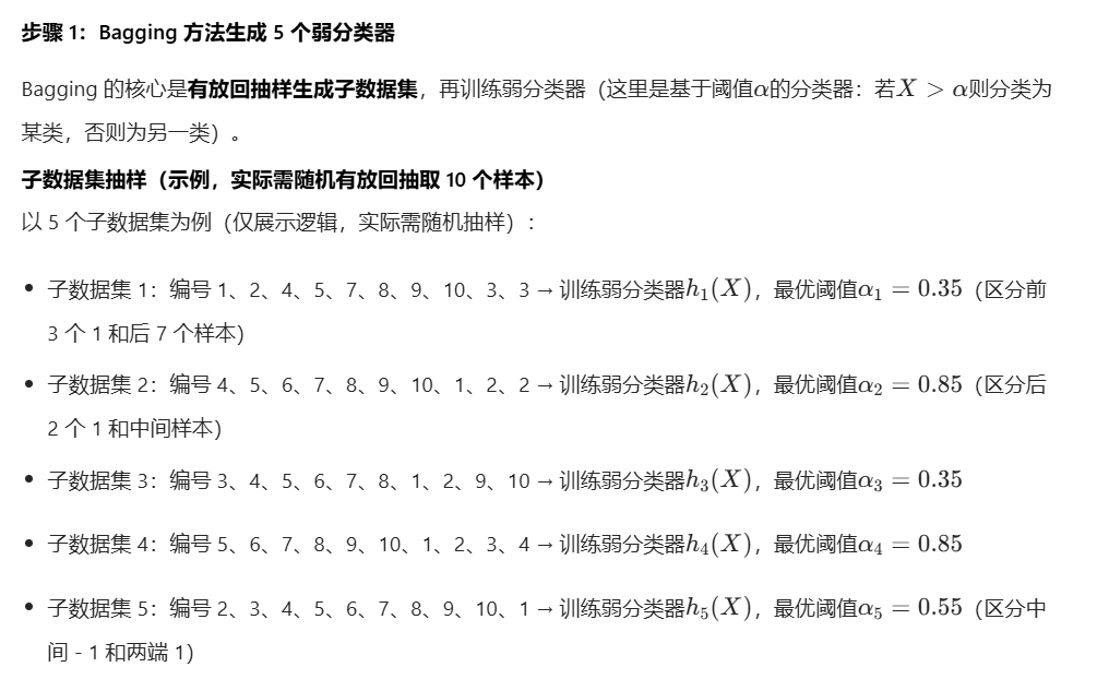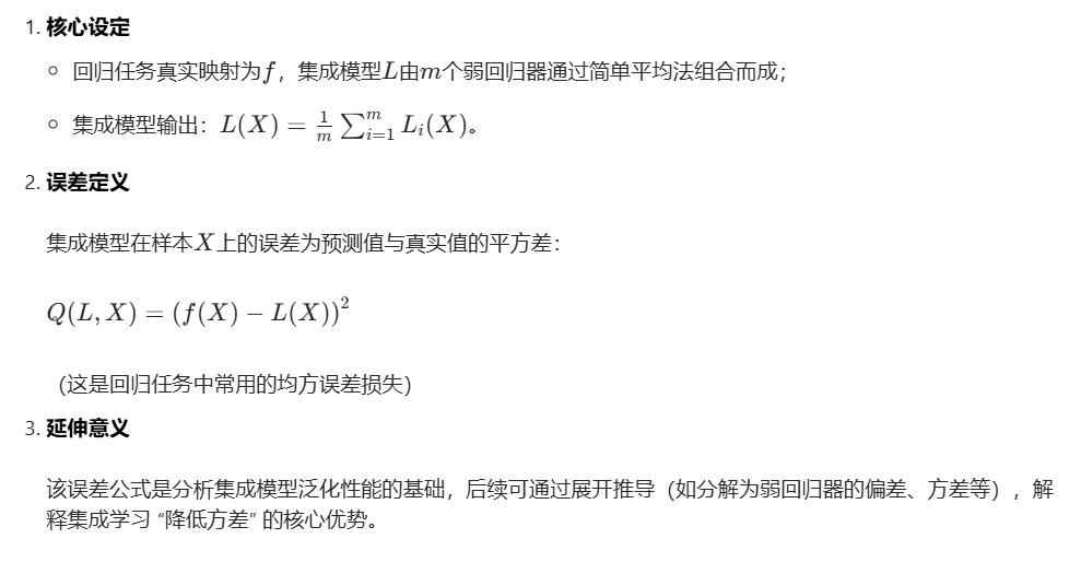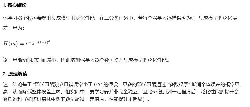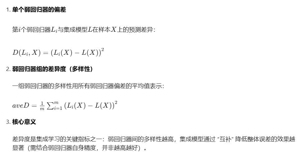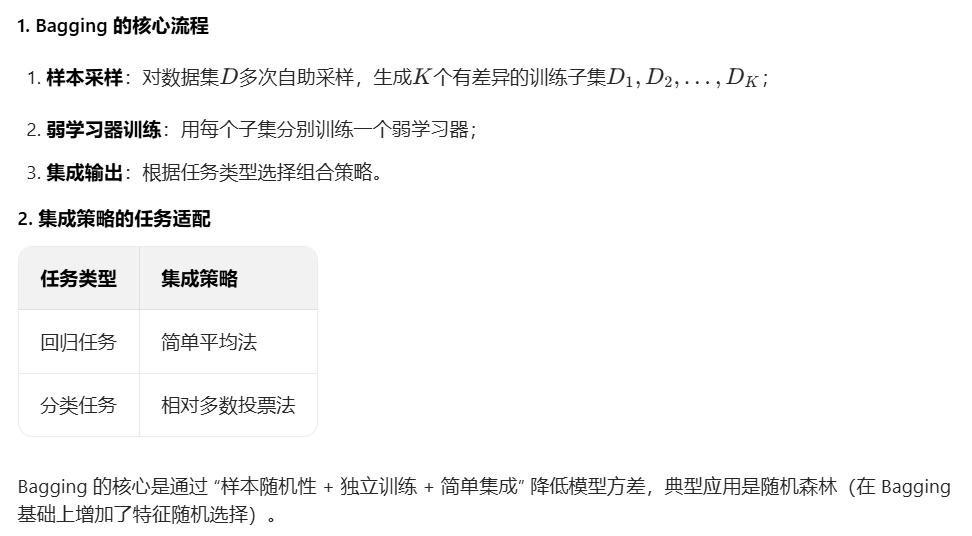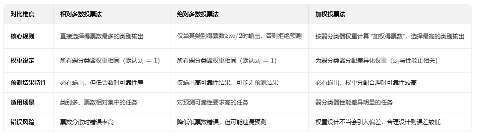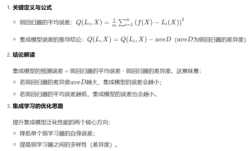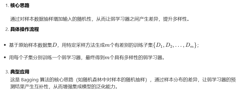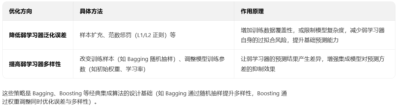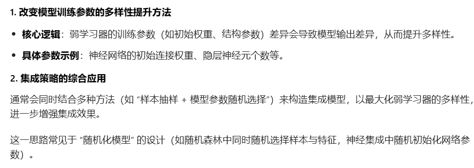 提高个体学习器的多样性:改变训练样本和改变模型训练参数。作用:通过调整训练数据分布(如 Bagging 的随机抽样)或模型参数(如不同的初始化权重、学习率),让各弱学习器的预测结果产生差异,从而增强集成后模型的方差抑制效果。
