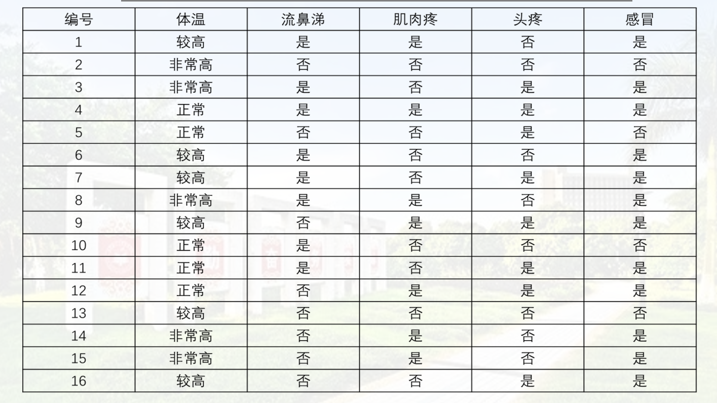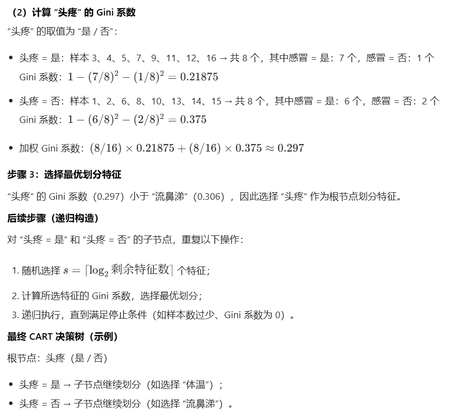 【例题5.3】表 5-6 是一个感冒诊断样本数据集,试用该数据集构造一颗作为随机森林弱学习器的 CART 决策树,在确定某结点的划分属性时,若该结点所对应属性集合具有m个特征,则规定从中随机选择s=⌈log_2m⌉个属性计算用于确定划分属性的基尼指数。
