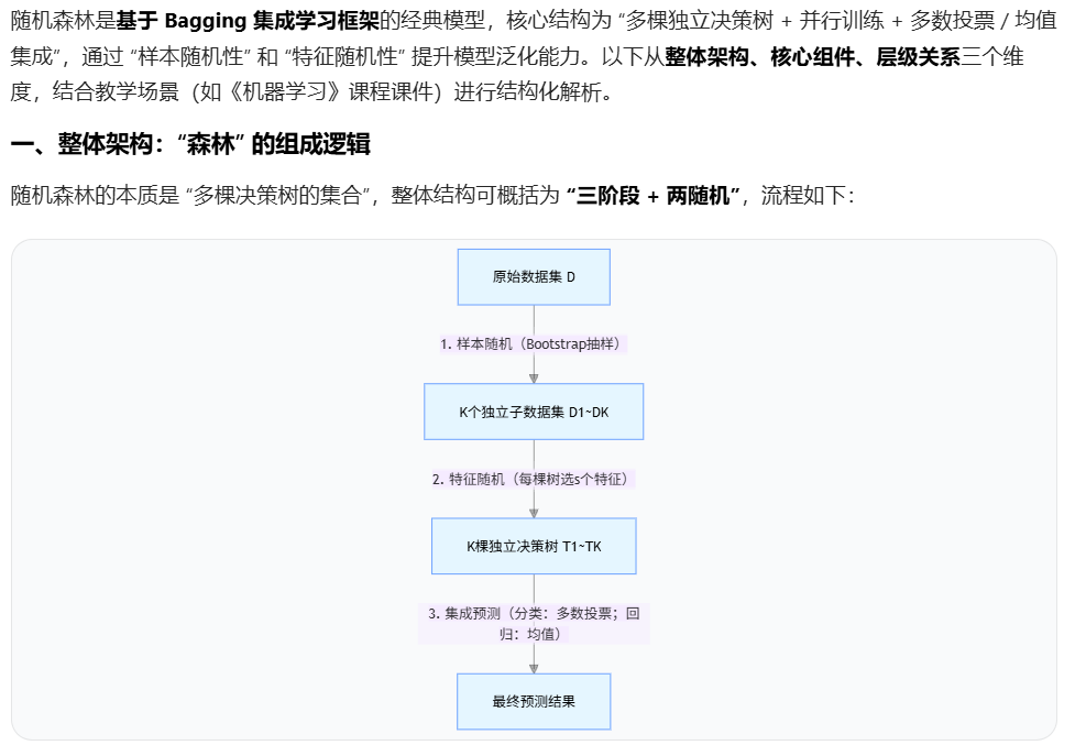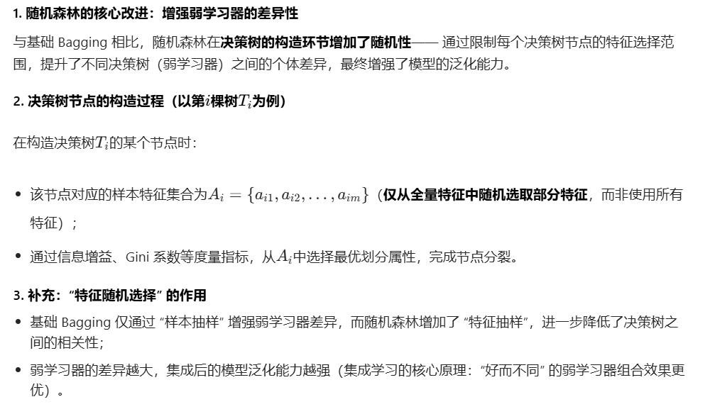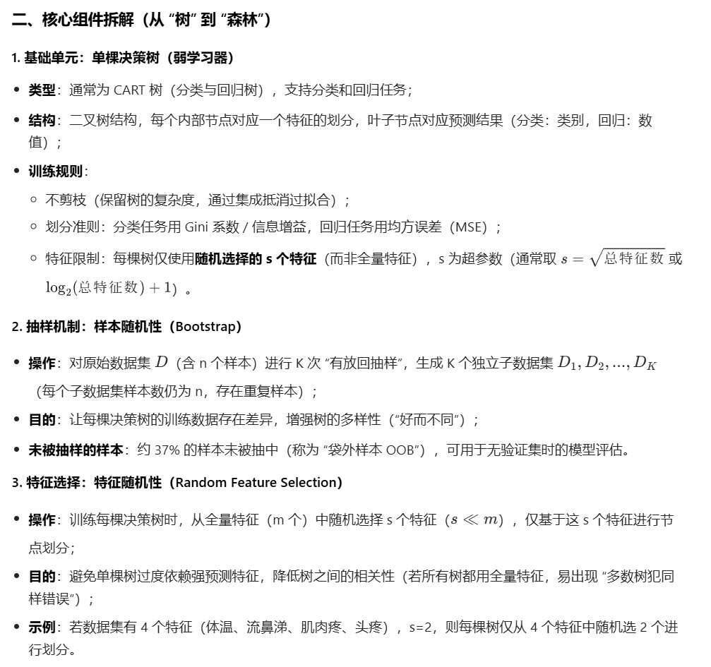 - 随机性:通过 "样本抽样" 和 "特征选择" 的双重随机,降低单棵树的相关性;