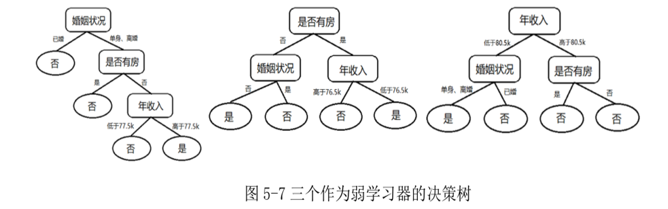 图 5-7 表示由某个贷款数据集通过随机性自助采样方式构造而成三个决策树模型。这三个决策树模型的结构有一定差异,对新客户是否会拖欠贷款的预测也有所不同。