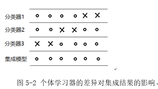 合理地选择弱学习器是集成学习首要必须解决的问题,例如,对于图 5-1 所示的二分类任务(圆圈表示分类正确,叉号表示分类错误),图中每个分类器的分类正确率均为1/3,则由少数服从多数原则进行组合得到集成模型的分类正确率为 0。