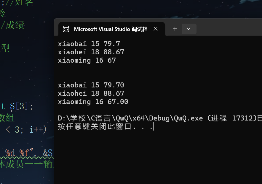 这里我们定义一个结构体包含一名学生的姓名(name)、年龄(age)、成绩(score)