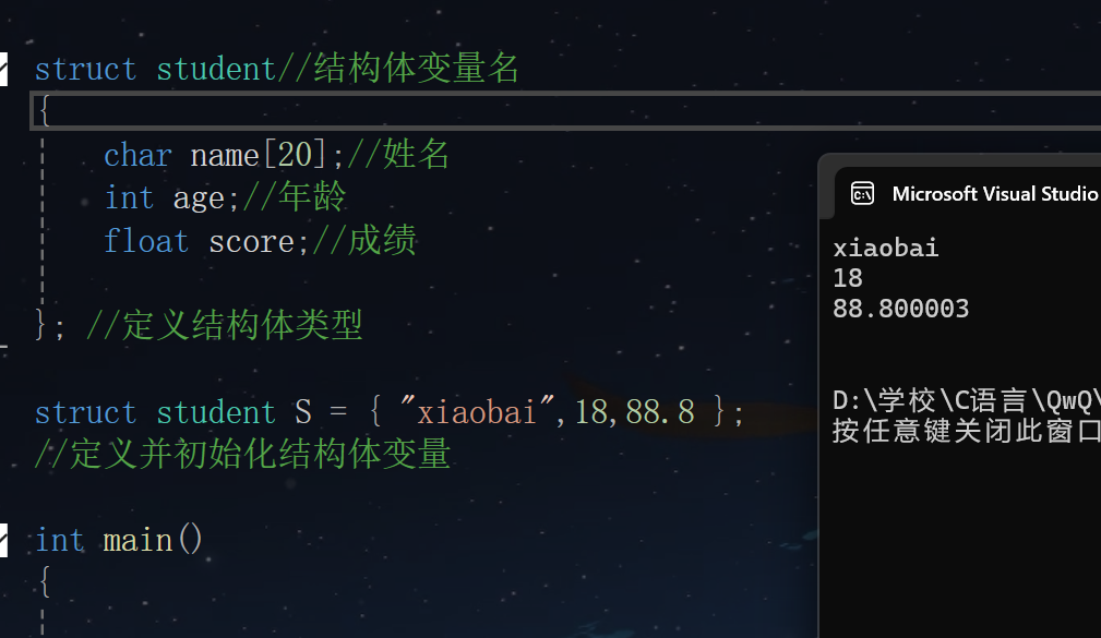 初始化后 xiaobai , 18 , 88.8 这些信息就被输入到结构体变量 S 中了