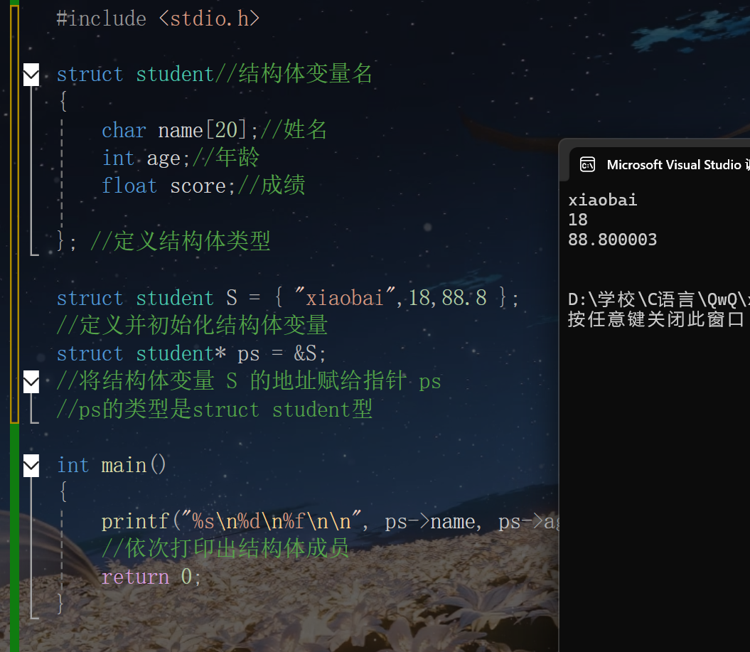 printf("%s\n%d\n%f\n\n", ps->name, ps->age, ps->score);