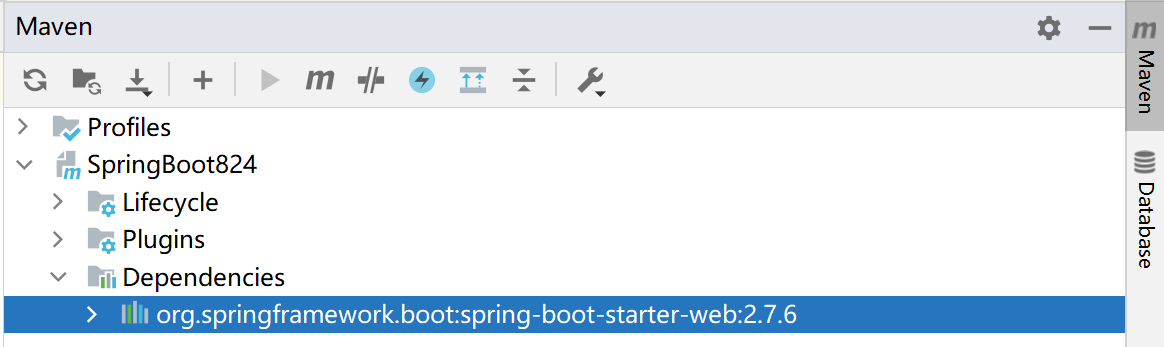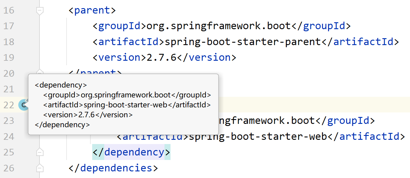 成功后的图片如下,Maven 会自动通过父工程 spring-boot-starter-parent 管理子依赖(如 spring-boot-starter-web)的版本,此时 左边会出现版本继承的标识。(2.7.6和2.7.6.RELEASE是完全等价的,二者指向同一个版本的依赖,Maven 会自动识别这种兼容性,这种设计是为了简化配置)