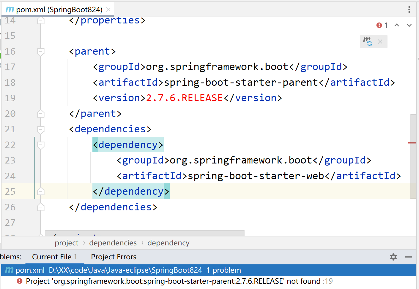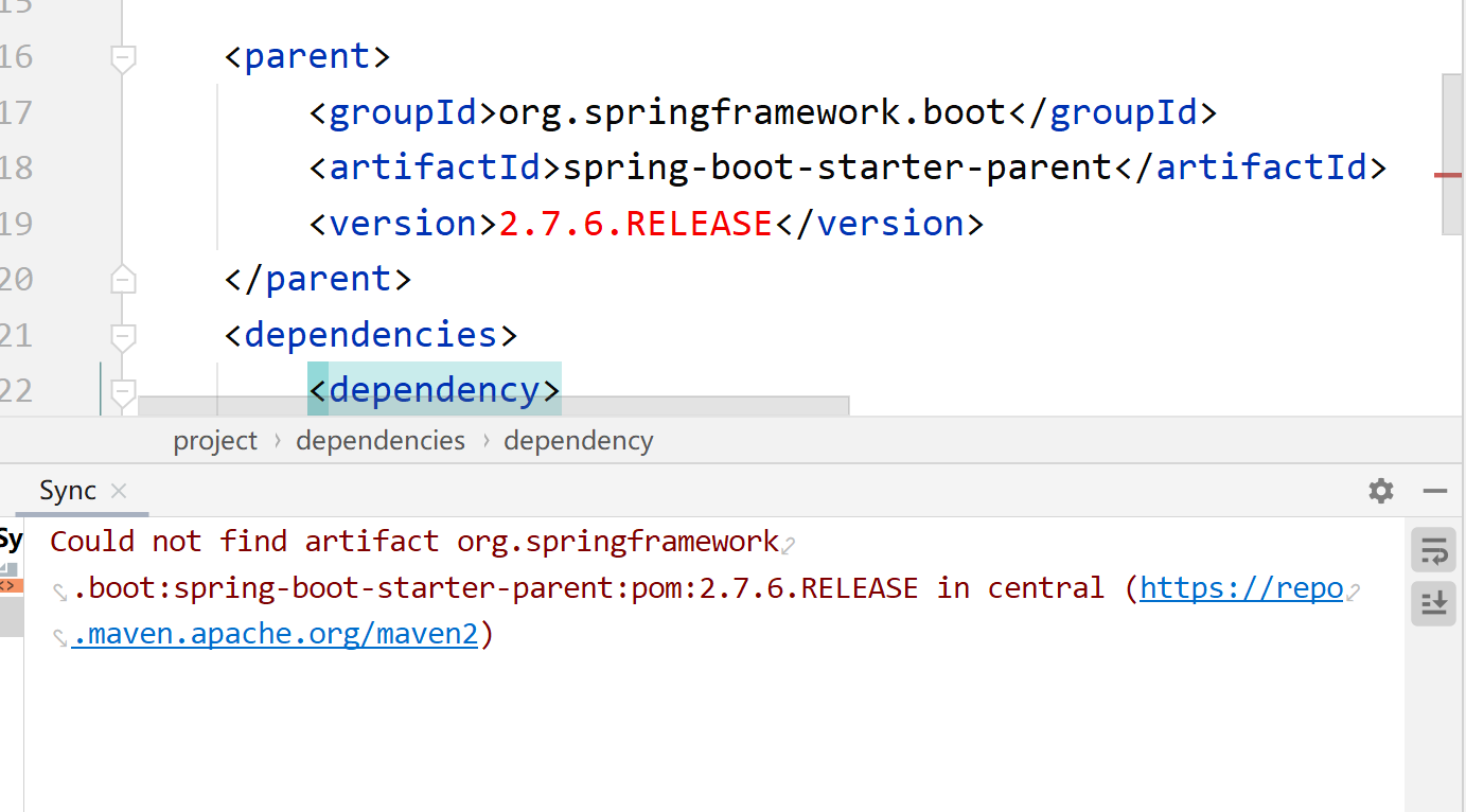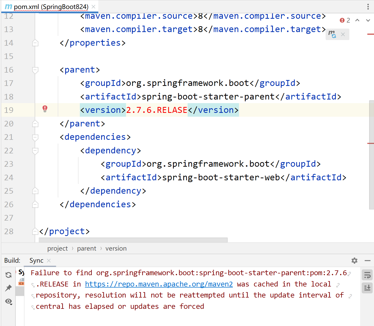 如果此时还是要用2.7.6.RELEASE,会出现下面错误。当你之前配置了错误的 groupId(如 org.springframework.boot 拼写错误),Maven 尝试从中央仓库下载 2.7.6.RELEASE 时失败了。Maven 会将这次 "失败结果" 缓存到本地,默认在 24 小时内不会再重新尝试下载,于是就出现了 "resolution will not be reattempted until the update interval..." 的提示。此时可以强制清除缓存并更新依赖进入项目根目录,执行 mvn clean install -U(-U 表示强制更新)。如果还是不行就手动删除本地仓库中对应依赖的缓存目录。找到本地 Maven 仓库路径(如 C:\Users\你的用户名\.m2\repository\org\springframework\boot\spring-boot-starter-parent)。删除 2.7.6.RELEASE 对应的文件夹,然后重新执行 "强制更新" 操作。