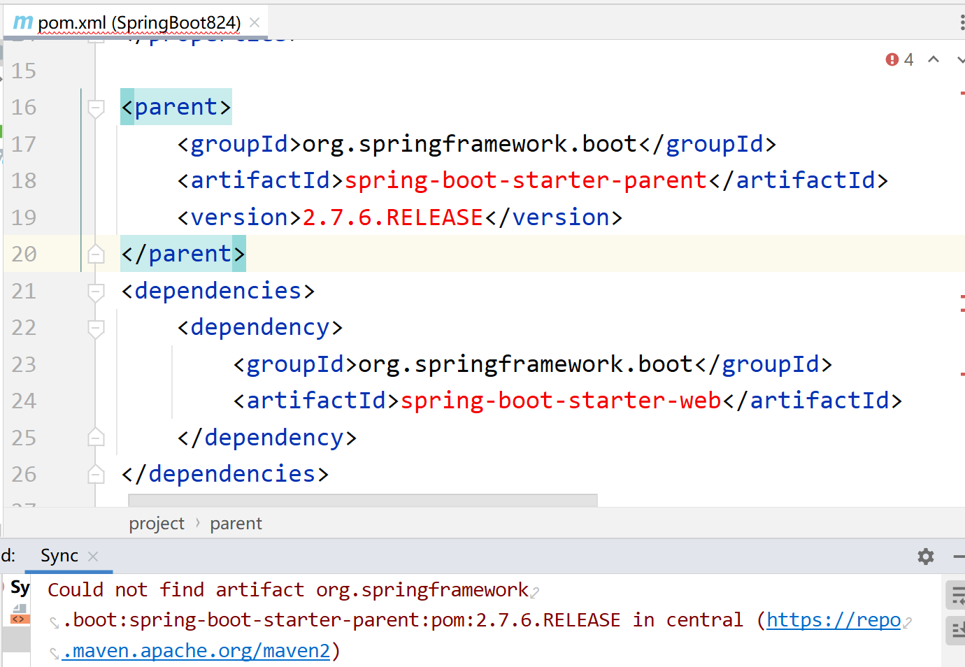 修改完后,会显示版本号找不到 ,此时可能是因为本地仓库中没有,写代码写完,会去本地仓库里面找。如果没有就标红。