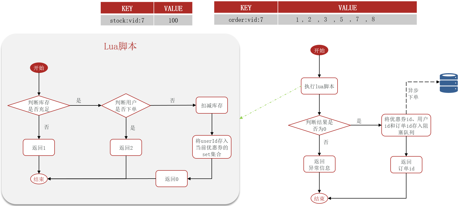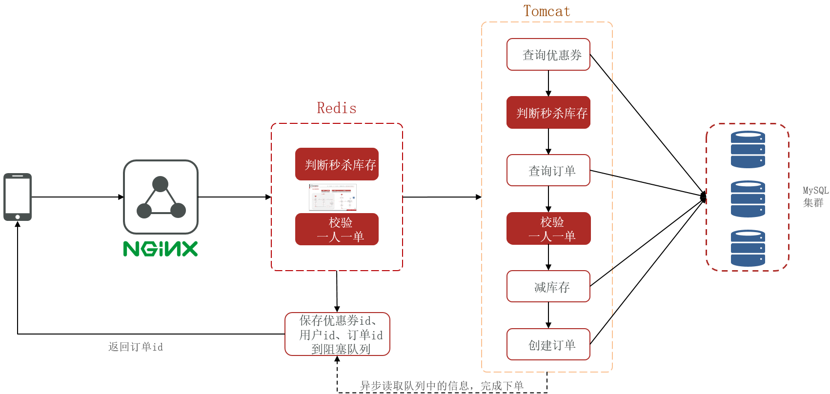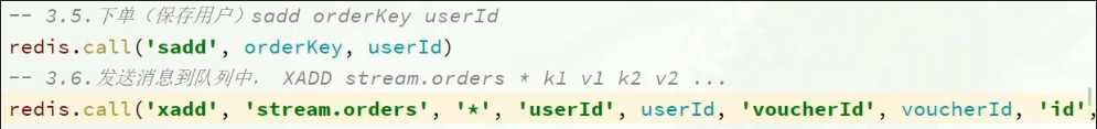 - 修改之前的秒杀下单Lua脚本,在认定有抢购资格后,直接向stream.orders中添加消息,内容包含voucherId、userId、orderId
