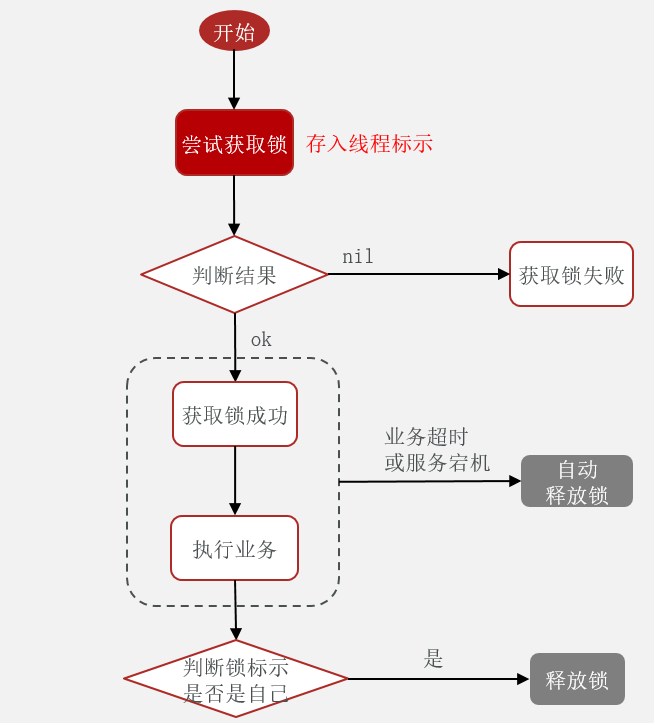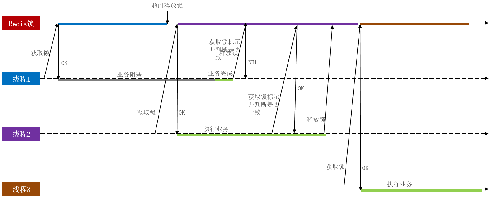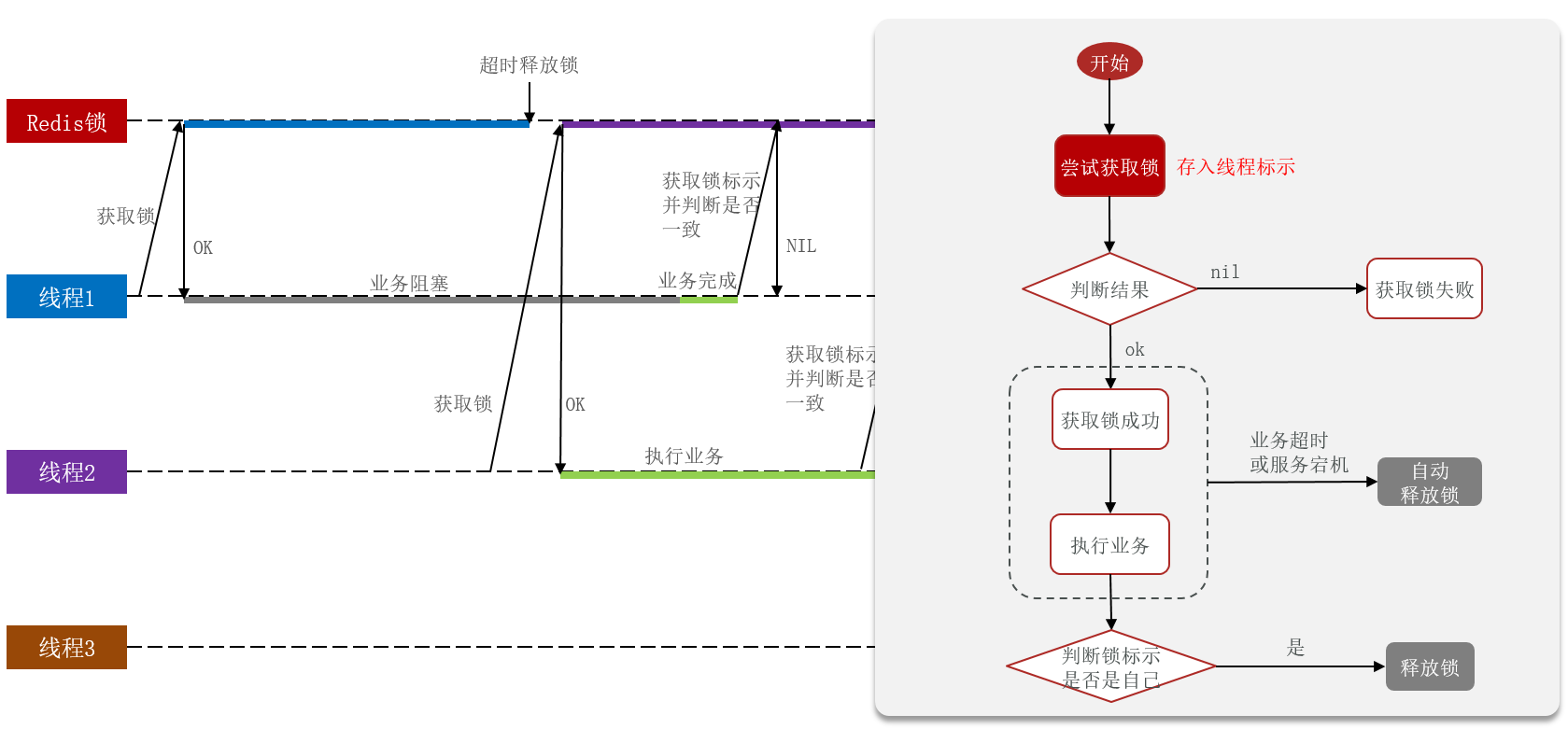 - 解决方案:解决方案就是在每个线程释放锁的时候,去判断一下当前这把锁是否属于自己,如果属于自己,则不进行锁的删除,假设还是上边的情况,线程1卡顿,锁自动释放,线程2进入到锁的内部执行逻辑,此时线程1反应过来,然后删除锁,但是线程1,一看当前这把锁不是属于自己,于是不进行删除锁逻辑,当线程2走到删除锁逻辑时,如果没有卡过自动释放锁的时间点,则判断当前这把锁是属于自己的,于是删除这把锁。