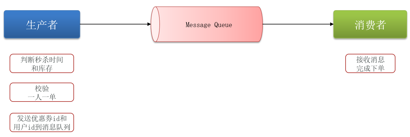 - 秒杀场景:我们下单之后,利用redis去进行校验下单条件,再通过队列把消息发送出去,然后再启动一个线程去消费这个消息,完成解耦,同时也加快我们的响应速度。