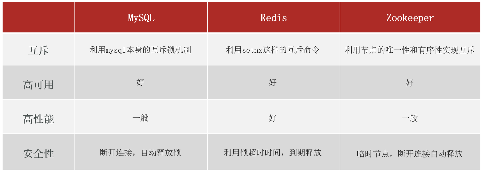 - Mysql:mysql本身就带有锁机制,但是由于mysql性能本身一般,所以采用分布式锁的情况下,其实使用mysql作为分布式锁比较少见
